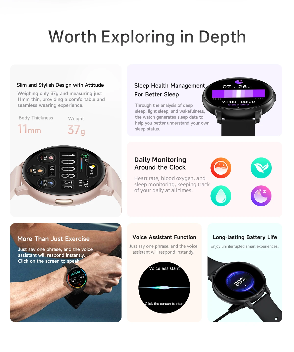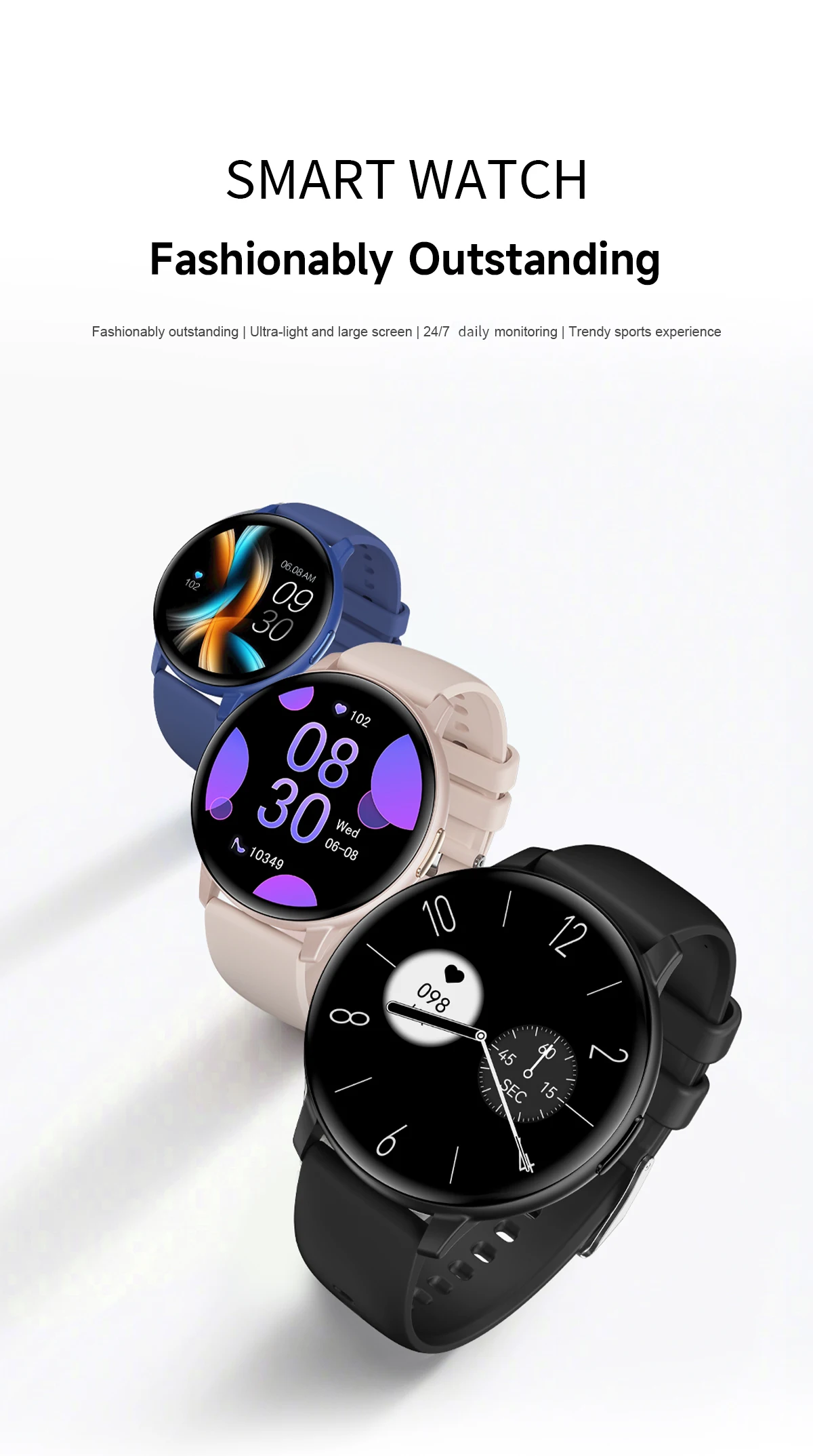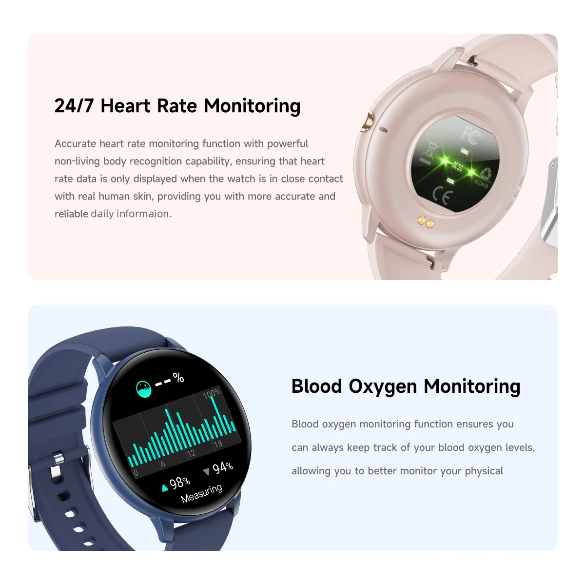 Chamada sem fio (faça, atenda e rejeite), assistente de voz, notificação de mensagem, monitoramento de saúde 24h, frequência cardíaca, oxigênio no sangue, monitor de sono, gerenciamento do período menstrual feminino, vários modos esportivos, passo, distância, calorias, treinamento respiratório, moda enorme mostradores, mostrador de relógio personalizado, lembrete de água potável, controle de música, câmera remota, previsão do tempo, despertador, exibição de hora e data, cronômetro, temporizador, calculadora, subir para despertar a tela