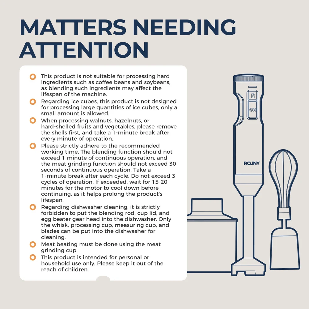 Liquidificador de imersão manual ROUNY 4 em 1, 1000 W, poderoso misturador de alimentos em bastão de aço inoxidável, copo de mistura de 700 ml, processador de 500 ml, batedor