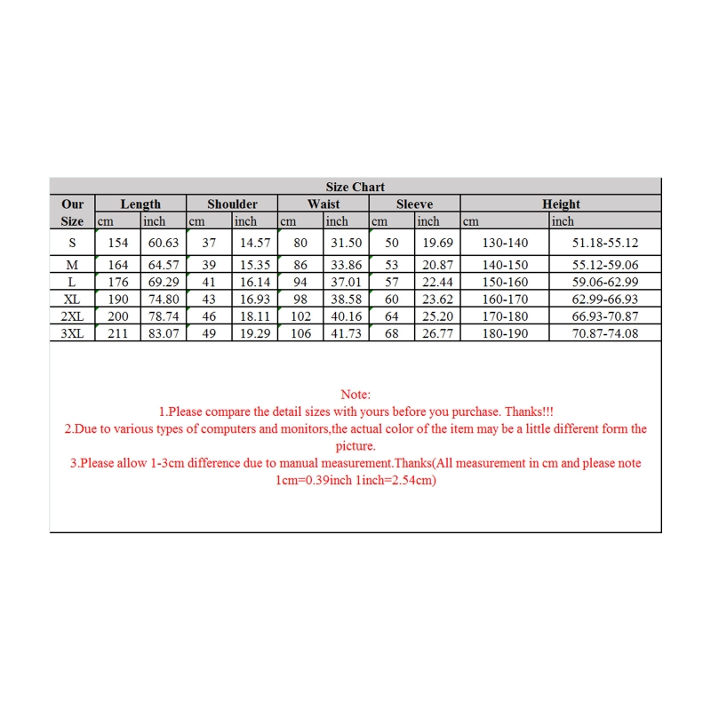 Altura: S:130-140CM/51,18 "-55,12" :140-150CM/55,12 "-59,06" L:150-160CM/59,06 "-62,99" XL:160-170cm/62,99 "-66,93" 2XL:170-180cm/66,93 "-70,87" 3XL:180-1906cm/70,87 "-74,08"