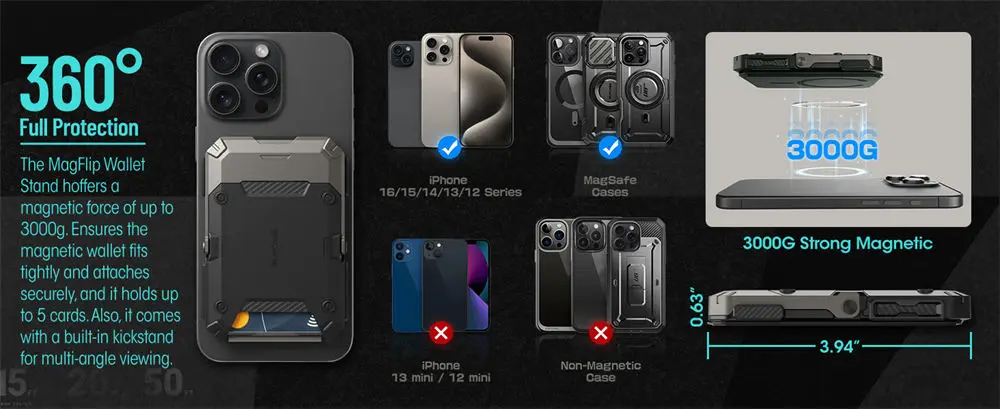 [Strong Magnetic Lock]:Built-in magnets, offering a magnetic force of up to 3000g. Ensures the magnetic wallet fits tightly and attaches securely to the back of your iPhone.