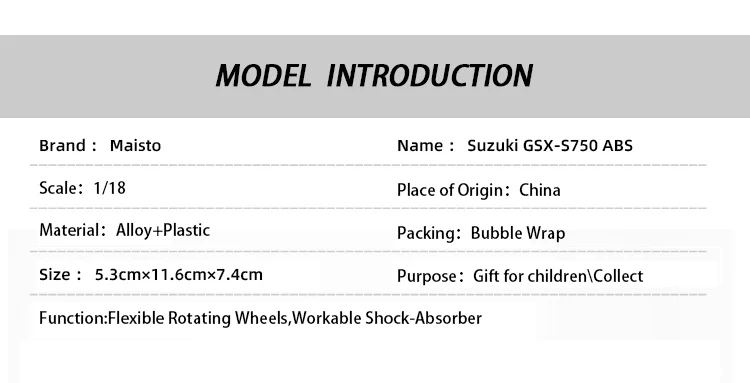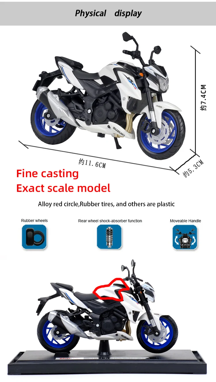 - > Maiisto-Diecast motocicleta modelo para crianças, liga ABS viável brinquedo, curto-absorvente presentes, Suzuki GSX-S750, coleção 1:18