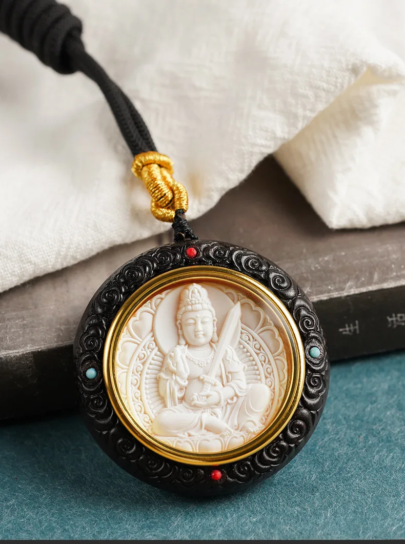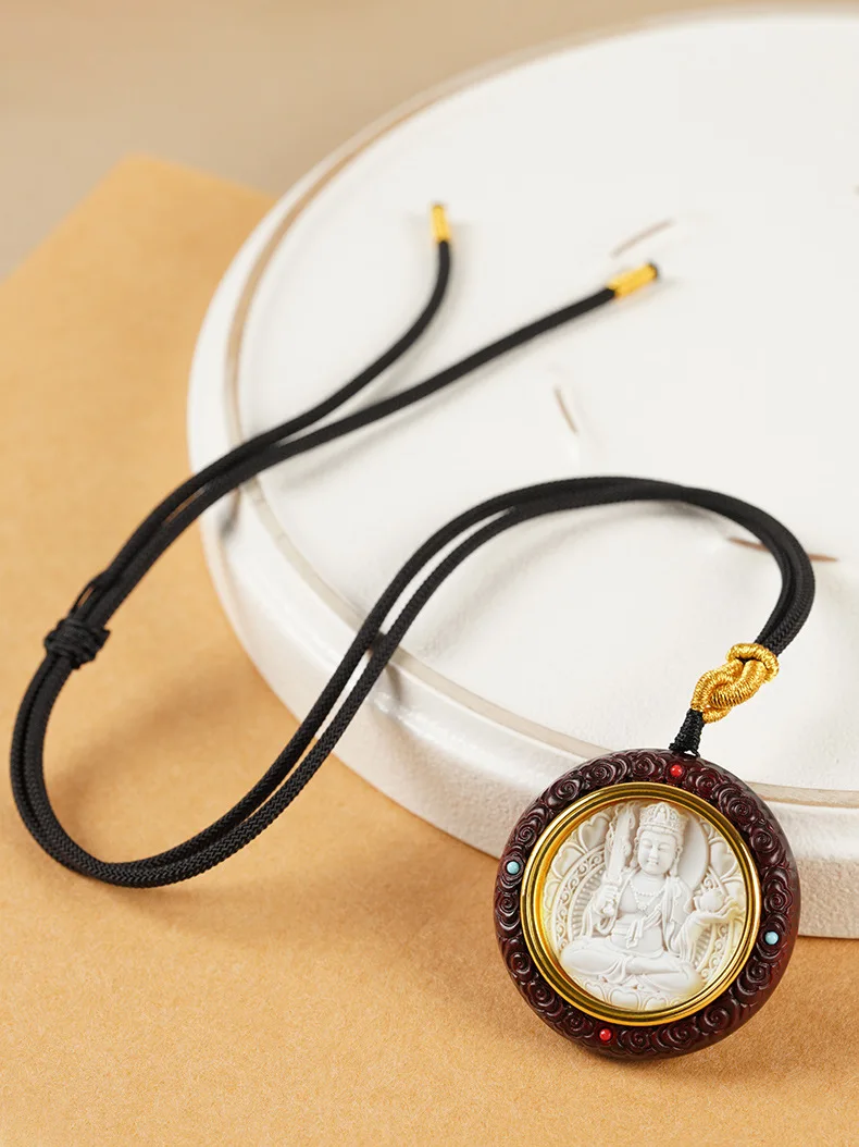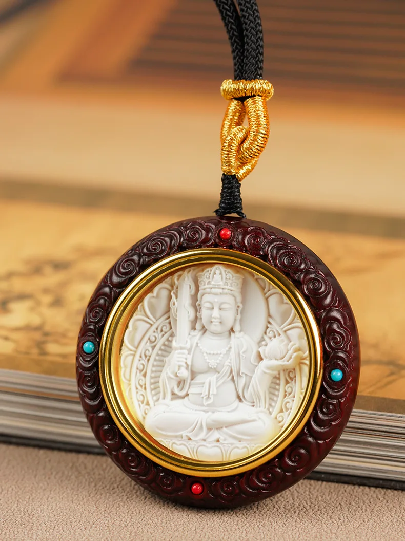 Marca redonda de Buda Natal, colar doze santo patrono do zodíaco, sândalo vermelho natural incrustado com marfim de mamut de alta imitação
