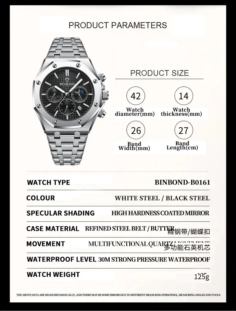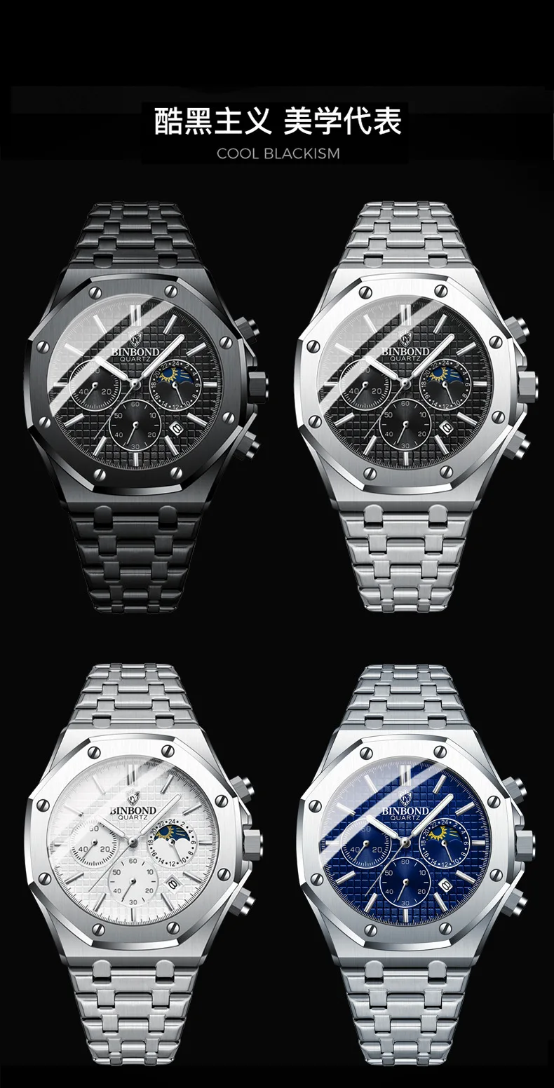 Marca superior homem relógio casual luxo luminoso binbond b0161 relógio de pulso aço inoxidável à prova dwaterproof água data calendário relógio