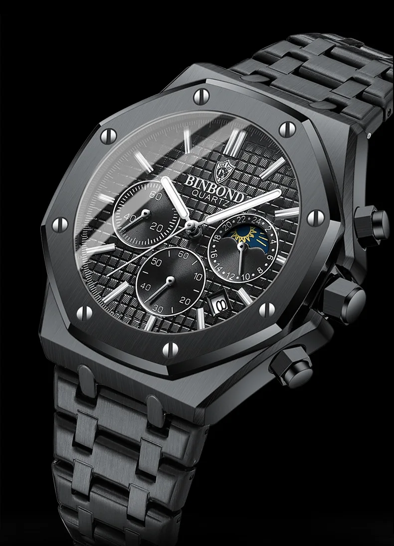 Recurso: TOOP WATCH, Resistente a choques, Retrapante, Luminoso, Data automática, Calendário completo, Fase da lua, Resistente à água, ponteiros luminosos