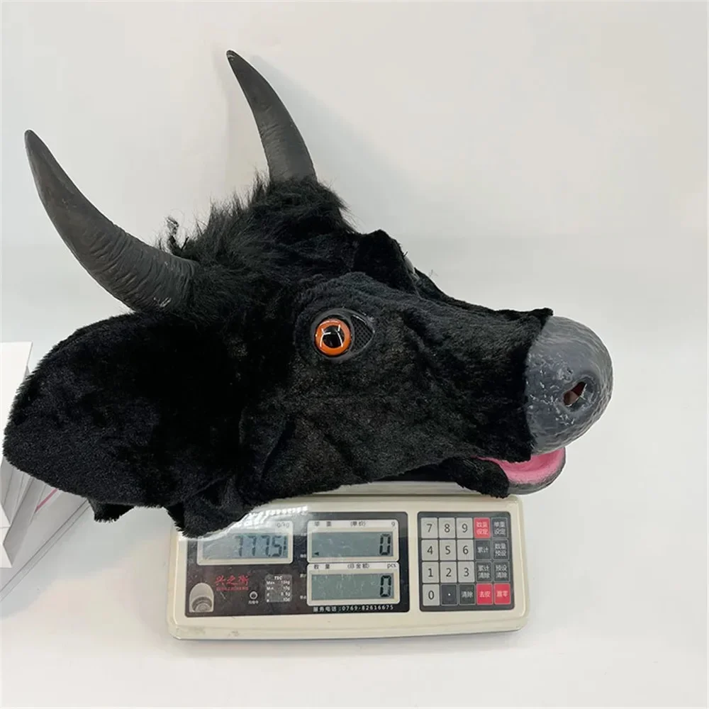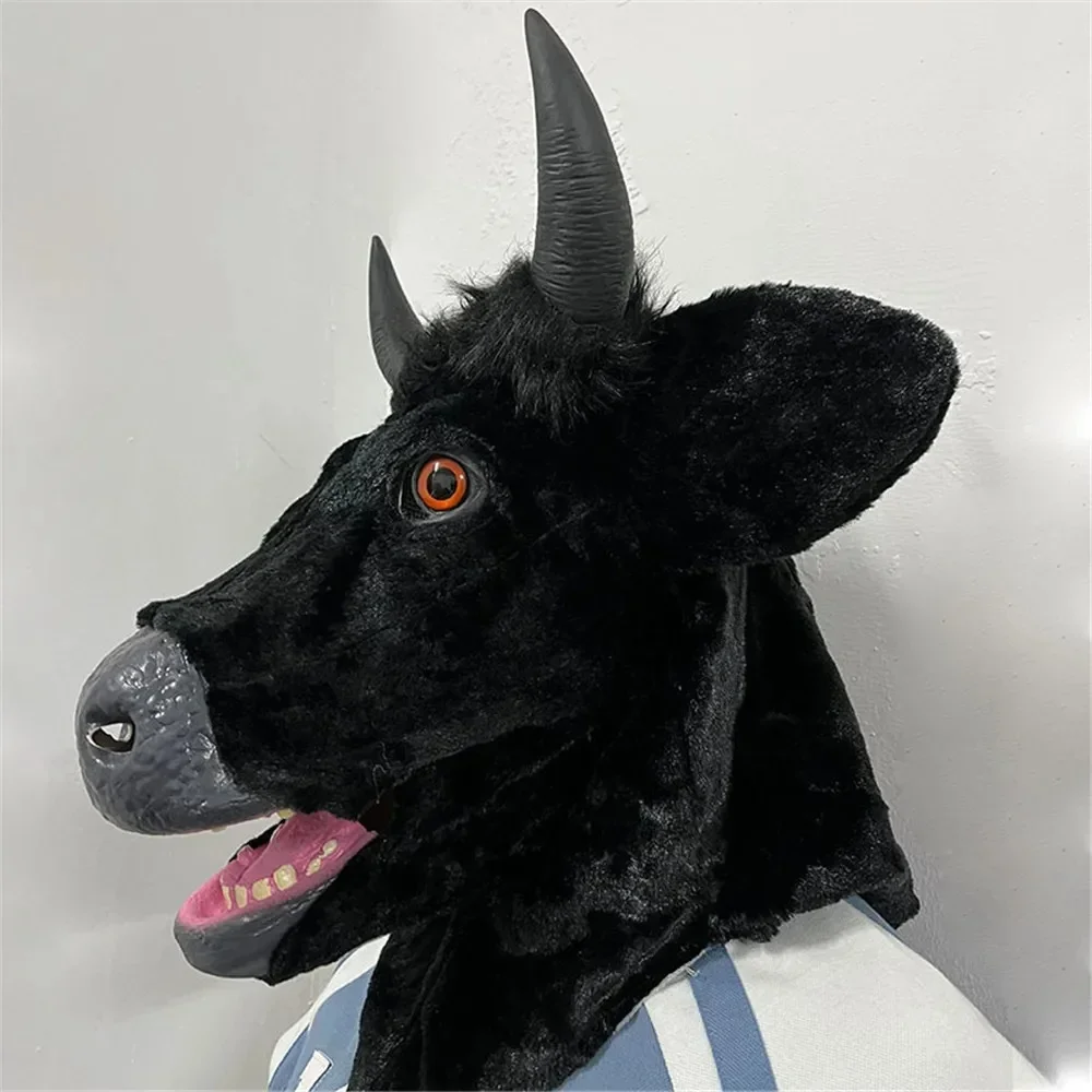 Máscara de chifre de boca em movimento realista horror vaca preta pelúcia headsuit halloween carnaval masquerade festa animal traje adereços