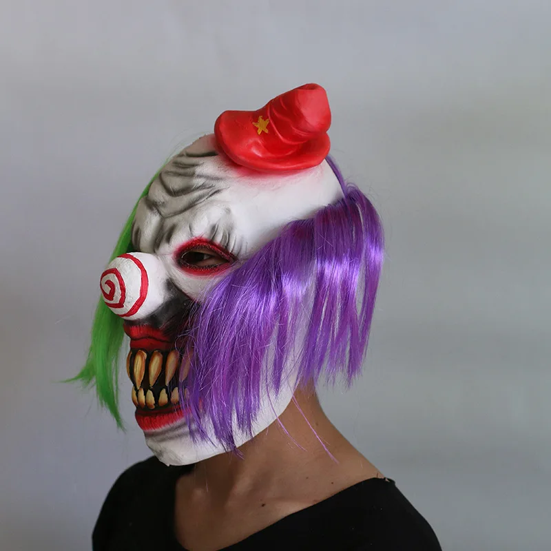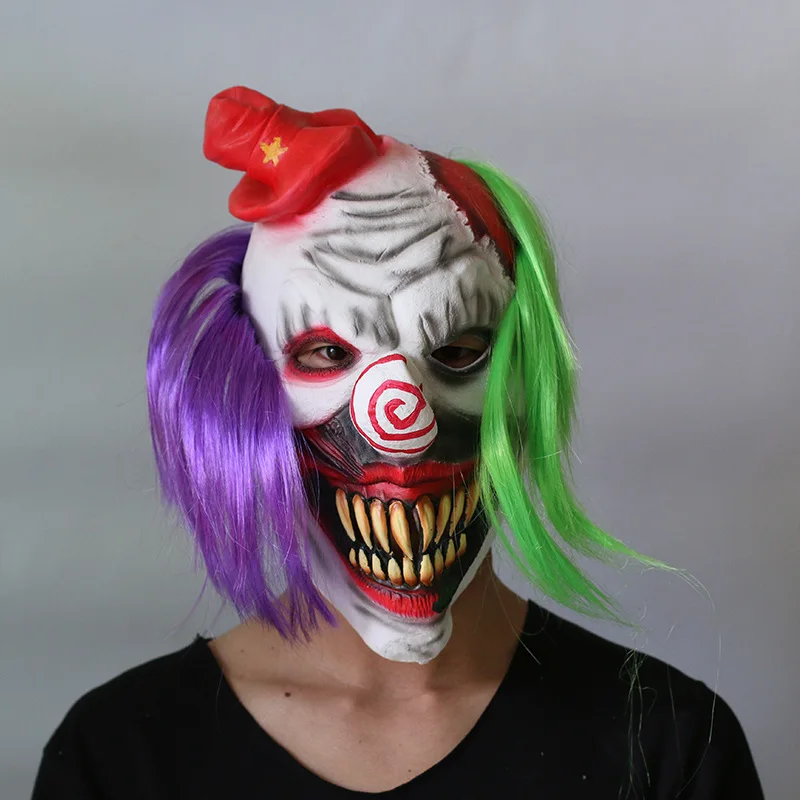 Máscara de palhaço assustador com cabelo verde roxo horror sorriso máscara facial traje de palhaço assustador halloween huanted casa prop