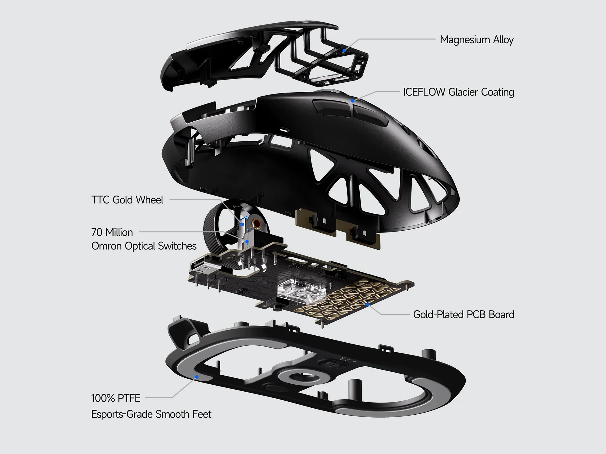 Os switches ópticos Omron classificados para cliques de 70 milhões oferecem desempenho confiável e preciso, emparelhados com um codificador TTC Gold para um rolagem suave e durável.