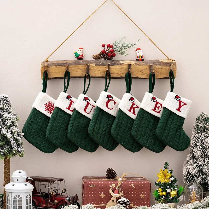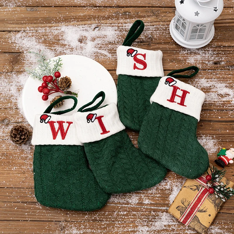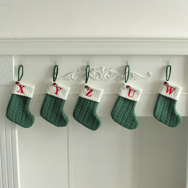 Meias de natal verdes de malha A-Z letras meias de natal penduradas árvore de natal pingente decoração crianças presente saco de doces