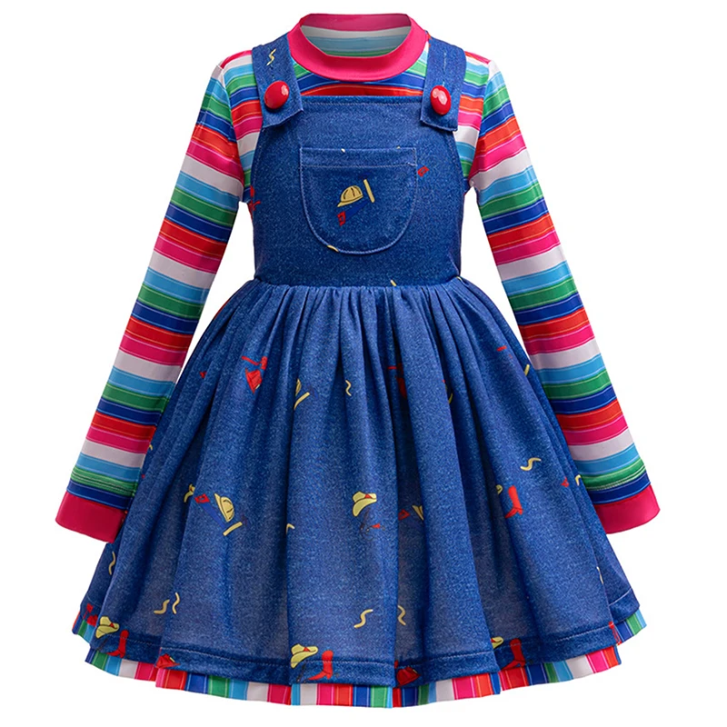 Meninas halloween cosplay traje chucky azul denim vestido arco-íris listrado camisa 2 pçs conjuntos para crianças horror cosplay filme outfit