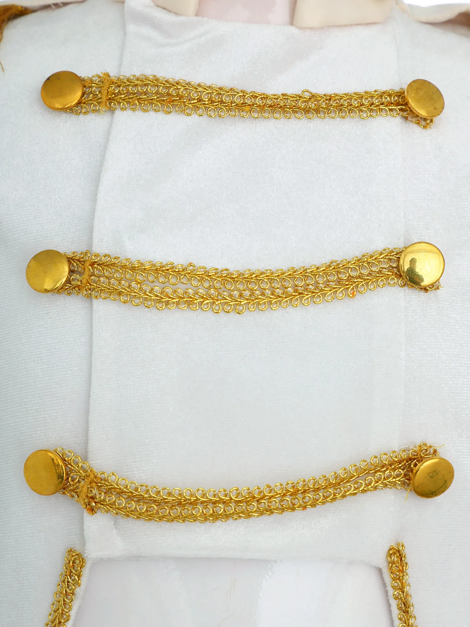Adornado com lenço com franja, trança dourada e botões decorativos dourados, adiciona estilo de corte real.