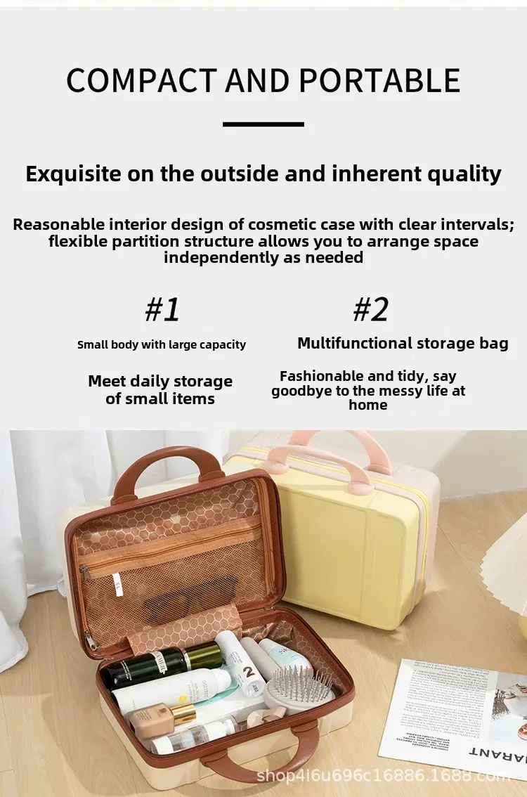 • Design Compacto:A Mini Mala é uma bolsa cosmética compacta de 14 polegadas, perfeita para viagens de curta distância ou viagens rápidas.