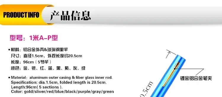 A haste da caneta tem um comprimento de encolhimento de 21 cm, um total de 5 seções (excluindo a seção da alça) e o comprimento da abertura é de cerca de 1 metro.A alça traseira e o corpo da haste da caneta são feitos de liga de alumínio puro e o corpo da haste é feito de fibra de vidro.