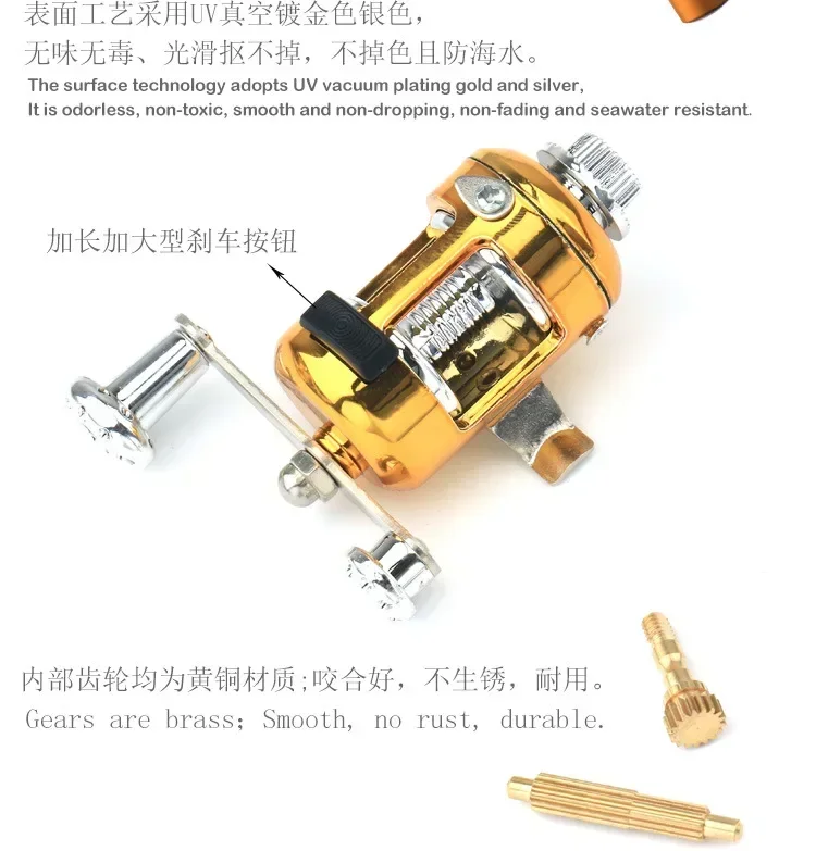 A roda correspondente é uma roda de tambor de plástico de alta resistência ST5-P, o material é náilon de alta resistência e o eixo do dente interno da roda é feito de cobre, que não enferruja e a qualidade é garantida.A roda tem comprimento total de 7,5 cm, comprimento do corpo de 4,5 cm, largura de 3,2 cm e peso líquido de 30 gramas.A extremidade do barco de pesca sem alça possui um botão de ajuste da força de freio, que pode ajustar a força de frenagem, e a lateral da roda com alça possui um botão preto, que pode aumentar o atrito quando pressionado.A relação de velocidade da roda é de 2,1 mm/m, e a capacidade linear é de 0,18 + 60 (mm/m), 0,20 + 55 (mm/m), 0,25 + 40 (mm/m).