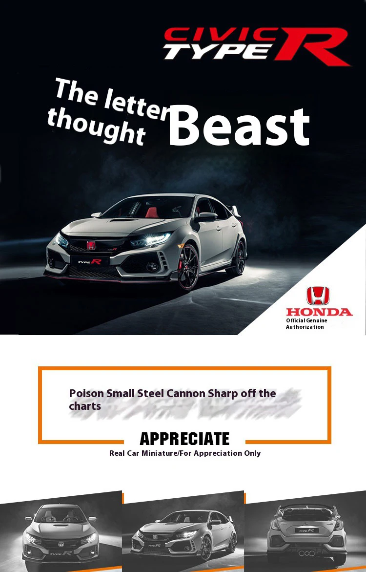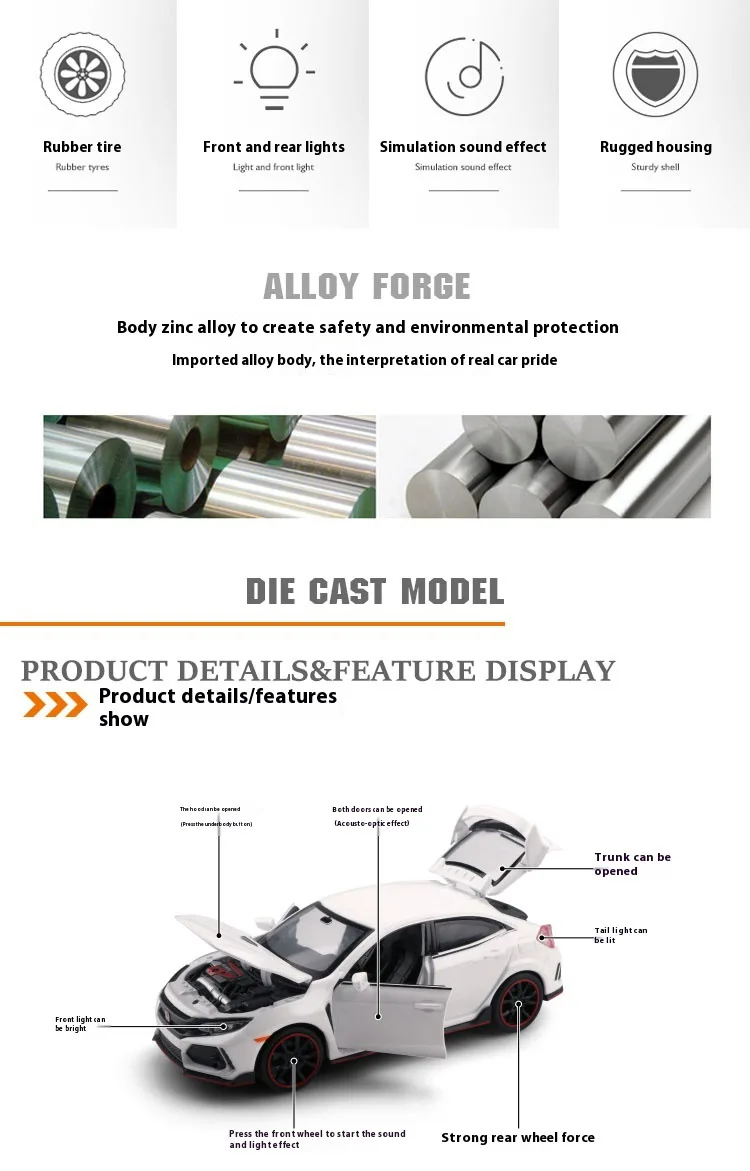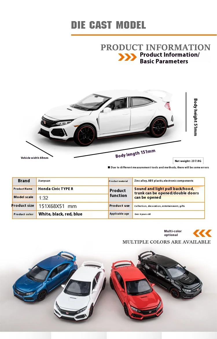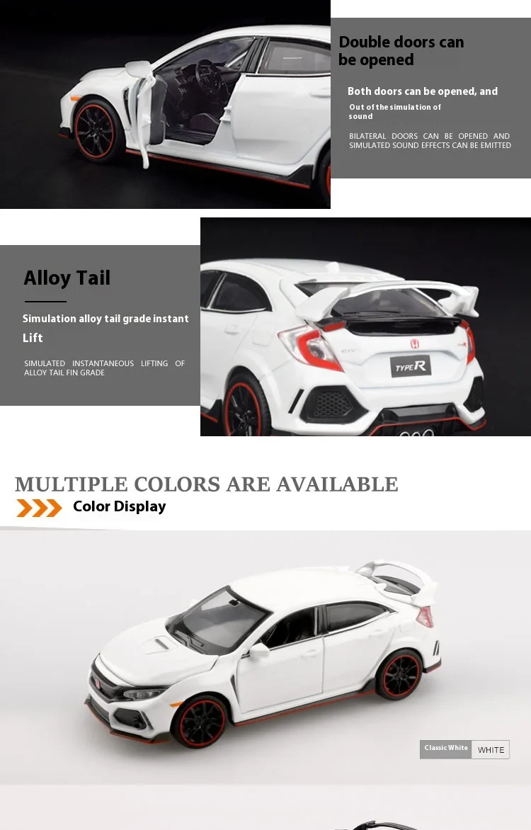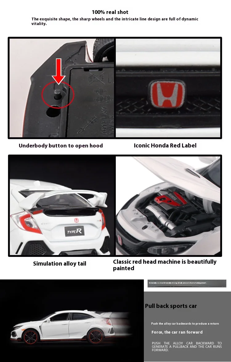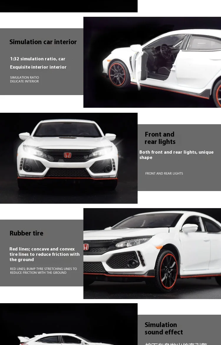 - > Miniaturas em escala 1/32 Honda Civic Tipo-R, carro esportivo, diecast, modelo, puxar para trás, brinquedo infantil presente de aniversário para meninos