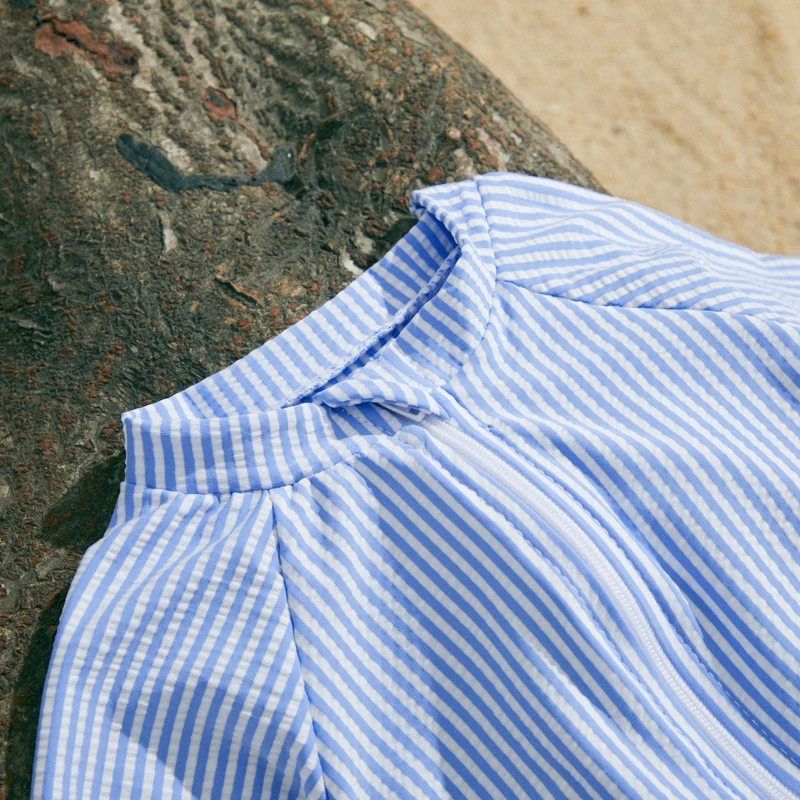 Maiô listrado para meninos, manga curta, meio zíper, sem bolinhas, conjunto de chapéu de sol