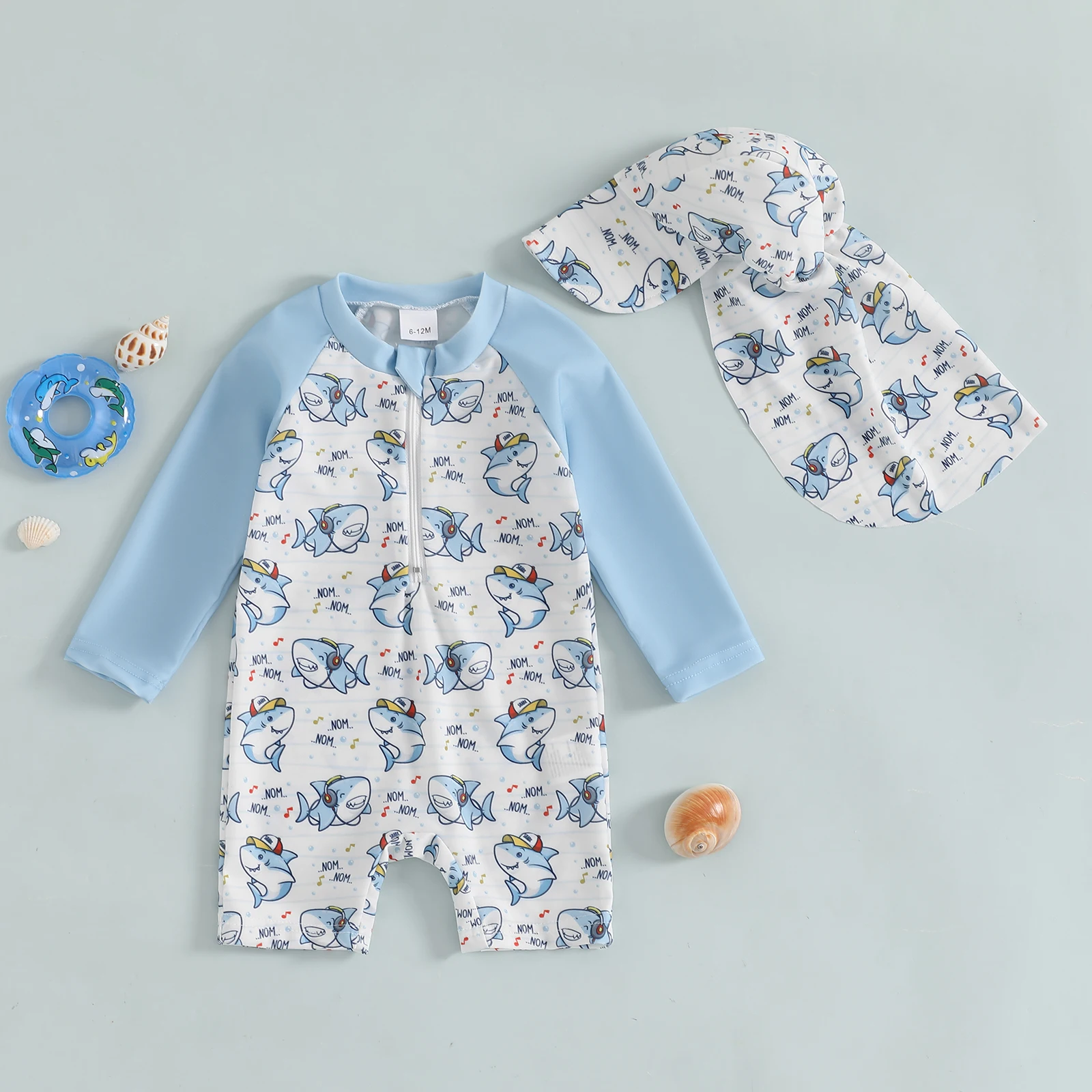 Maiô protetor contra erupção cutânea para meninos com estampa de dinossauro/hark, manga comprida com zíper e touca de natação