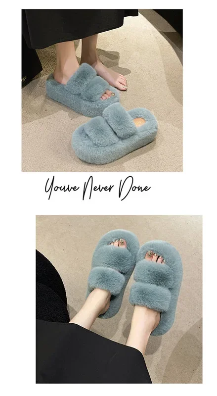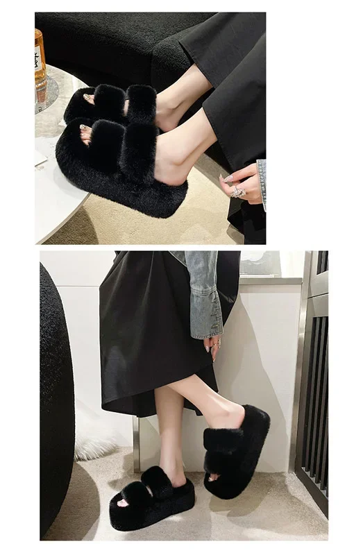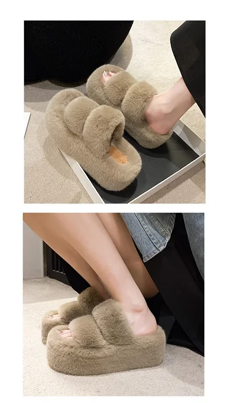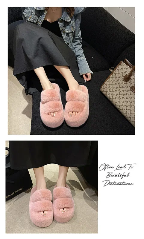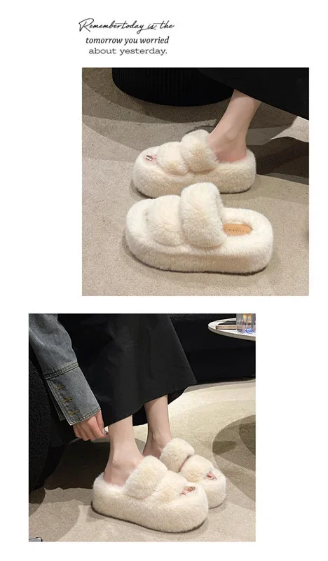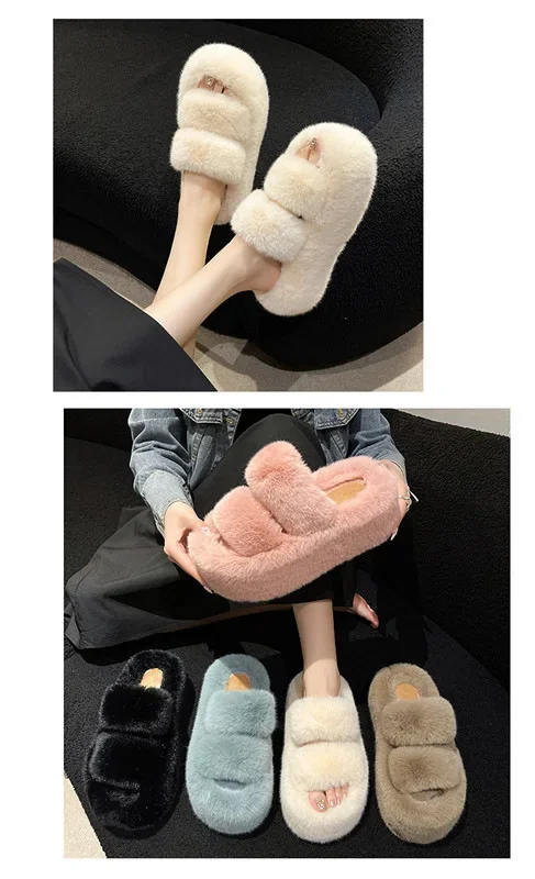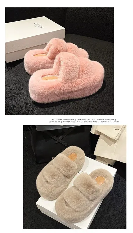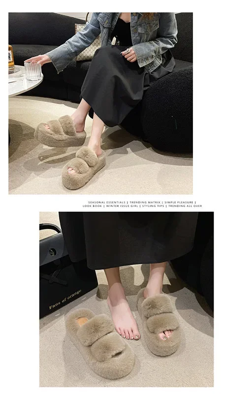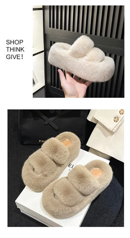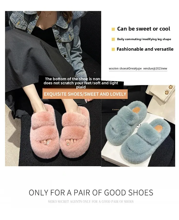 Moda feminina chinelos de pele fundo grosso sola macia interior ao ar livre casa sapatos outono inverno novo estilo fundo de borracha forrado de veludo