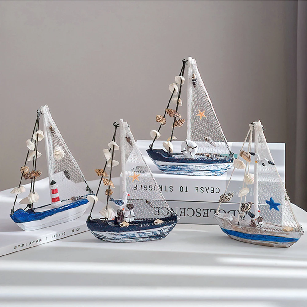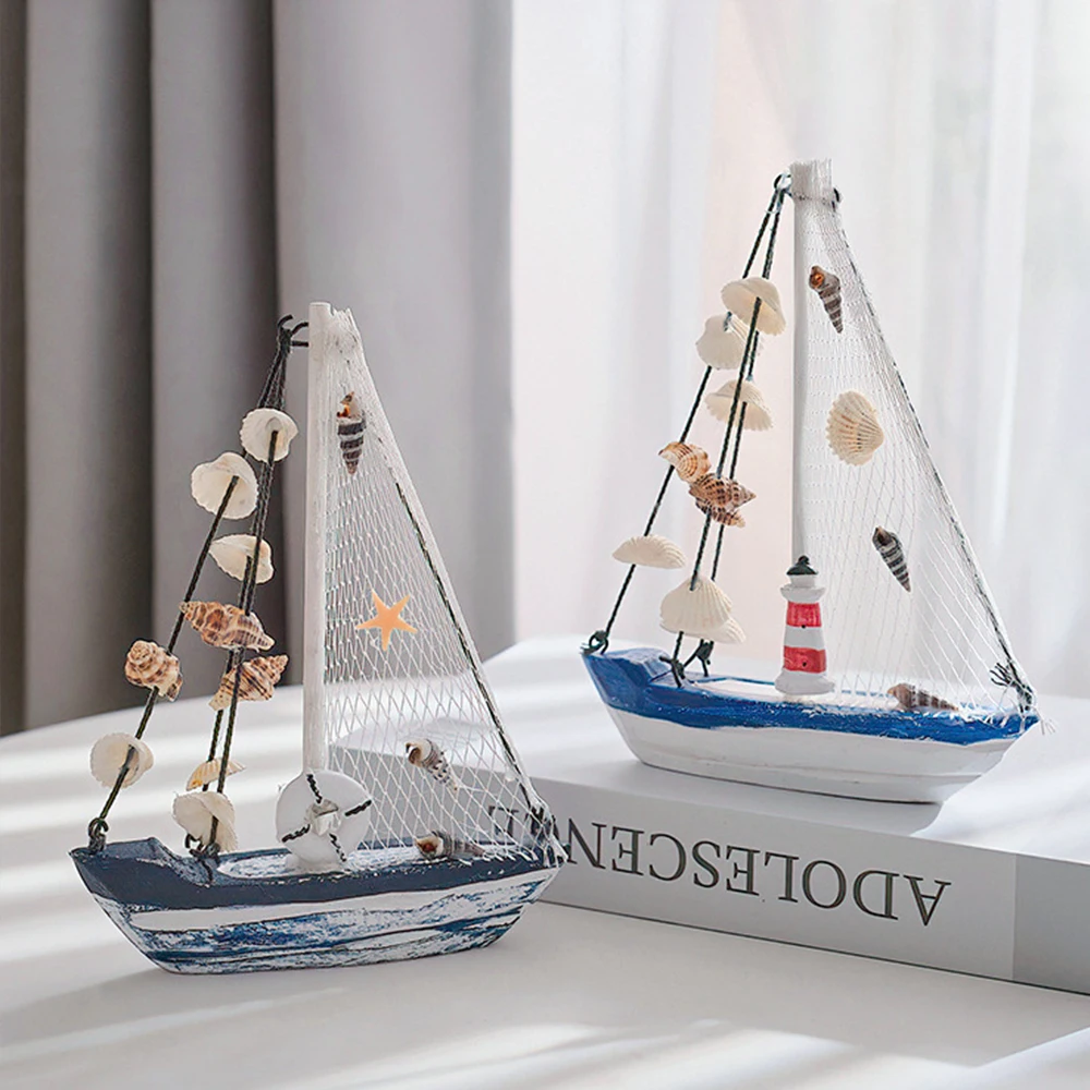 Modelo de barco a vela de madeira estilo mediterrâneo, artesanato ornamentos, acessórios de decoração para casa, decoração da sala, presentes 19cm