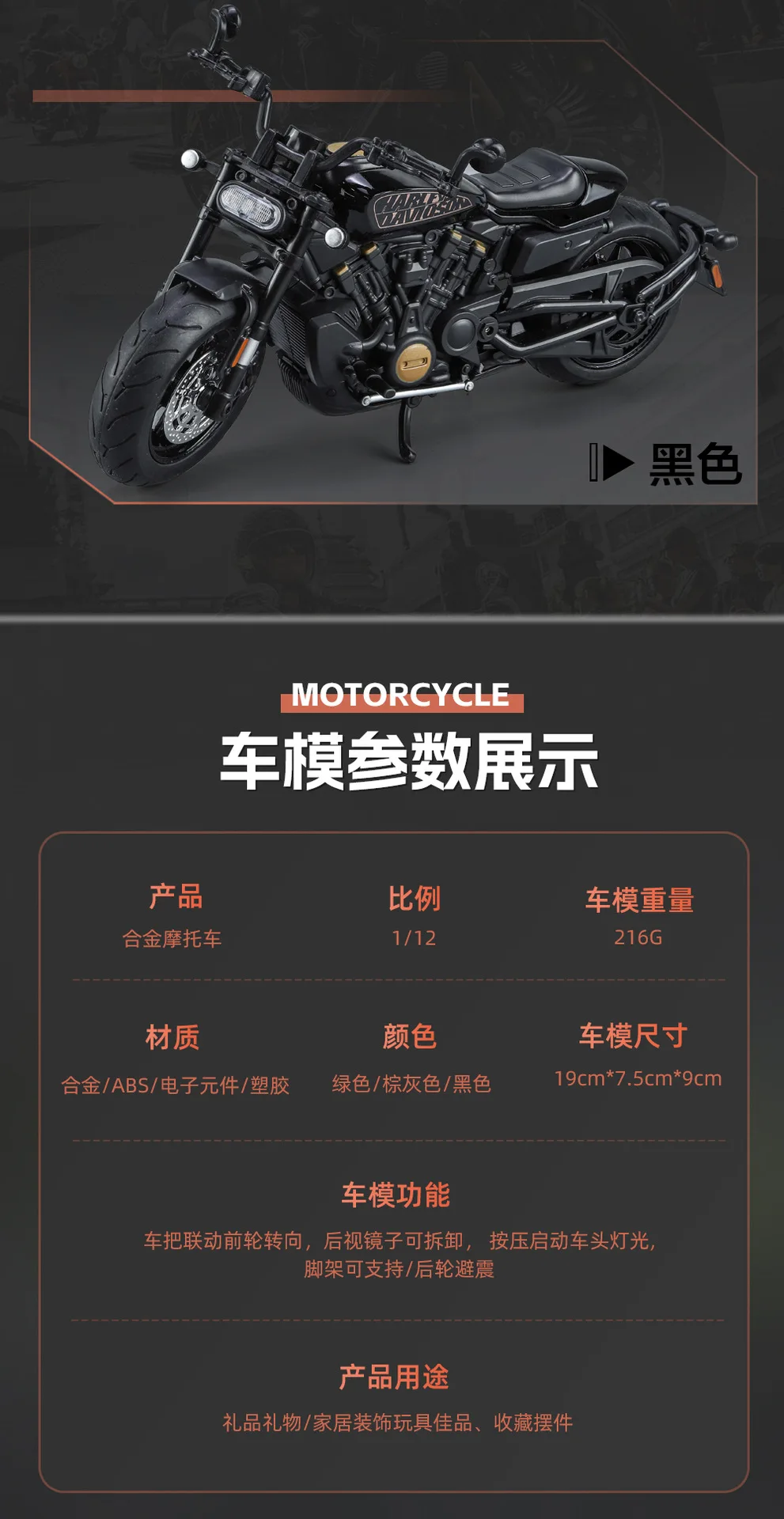 Modelo de motocicleta Harley Sportster S Diecast para crianças, 1:12, corrida de liga, esportes de rua, M41