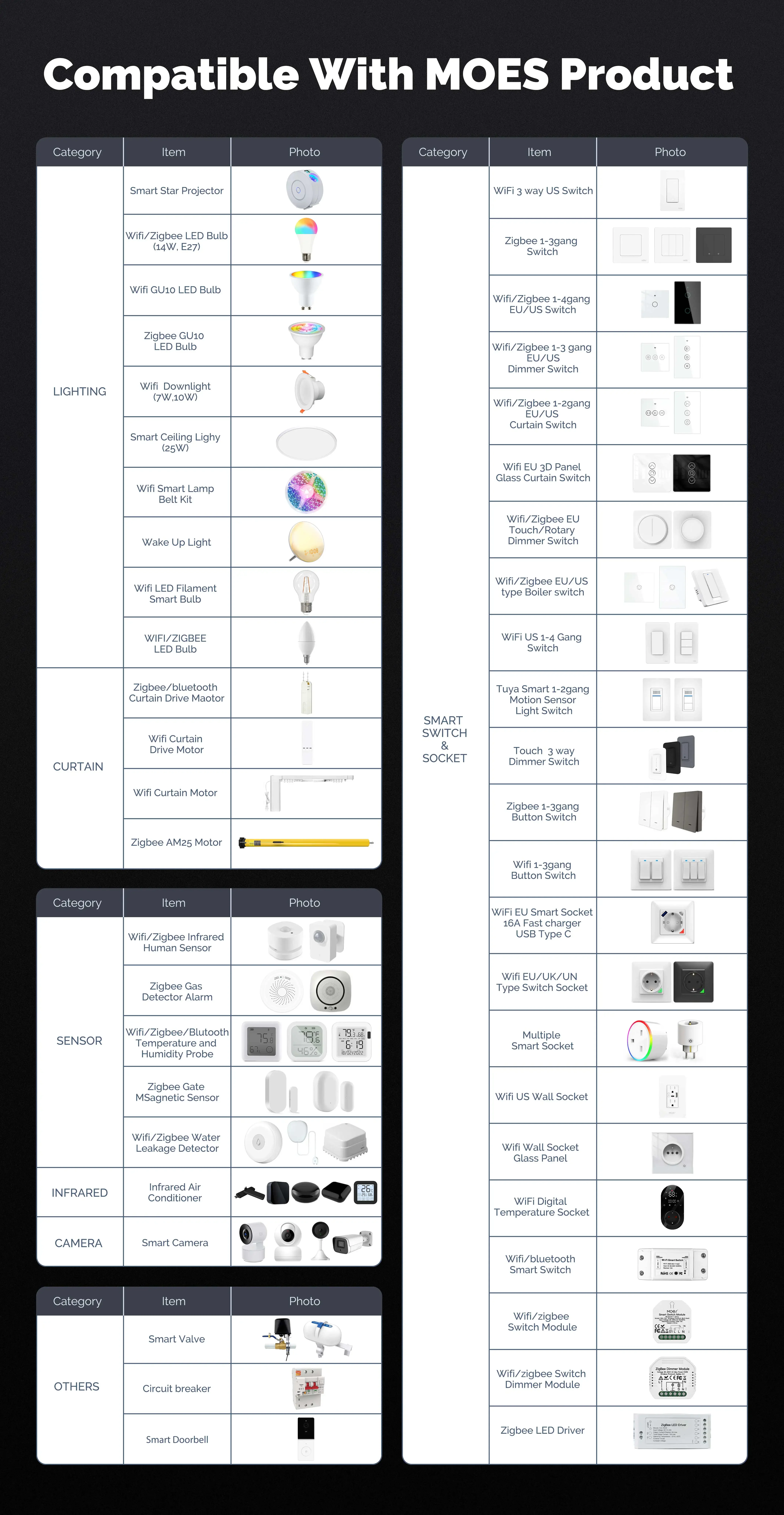 O painel, compatível com over410000 de produtos ecológicos Tuya, pode controlar até 20 tipos de produtos e adicionar mais de 80 dispositivos, para satisfazer suas necessidades com um clique para experimentar uma vida inteligente em várias cenas.