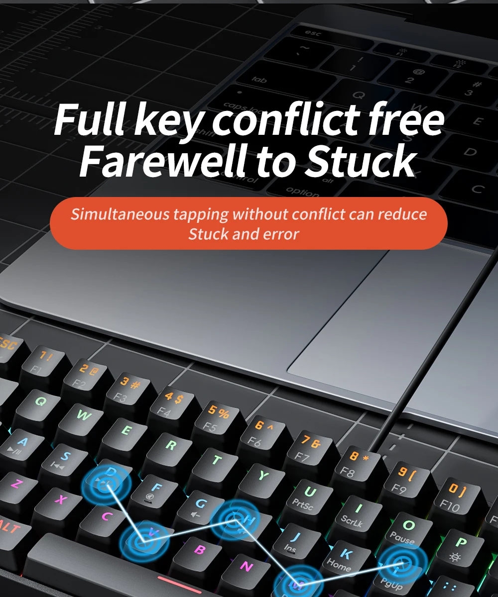 • Retroiluminação MULTICOLOR:O teclado Mucai possui uma luz de fundo MULTICOLOR, proporcionando uma experiência visual vibrante e atraente durante jogos ou digitação.
