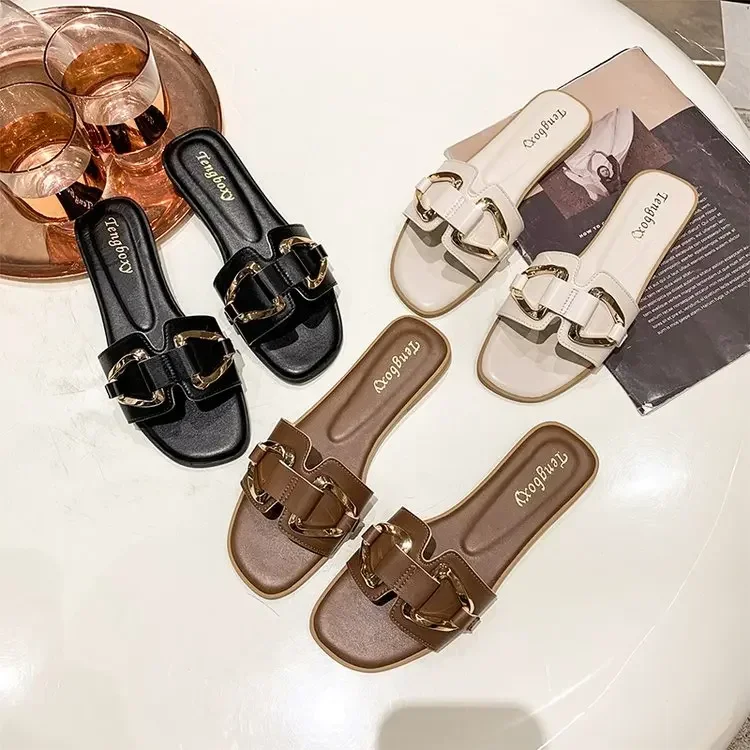 Mulheres decoração de metal única banda sandálias planas moda sexy dedo do pé aberto ao ar livre slides luxuoso escritório senhoras festa sapatos femininos