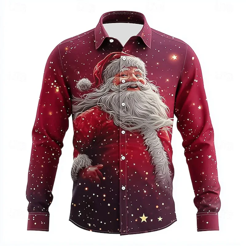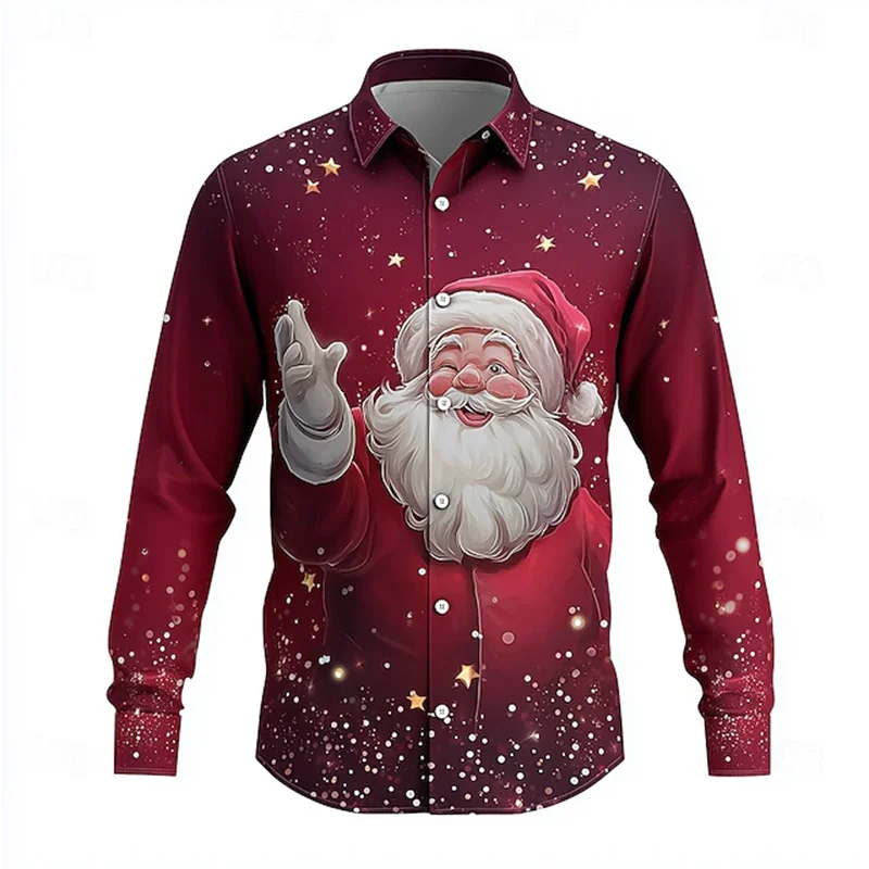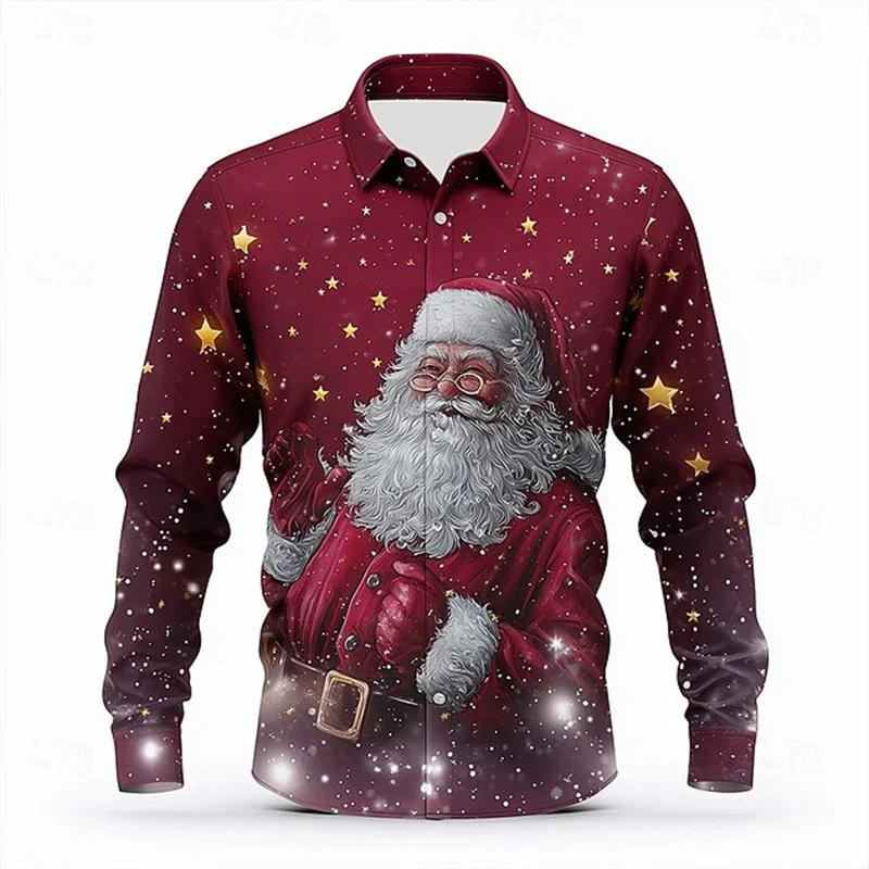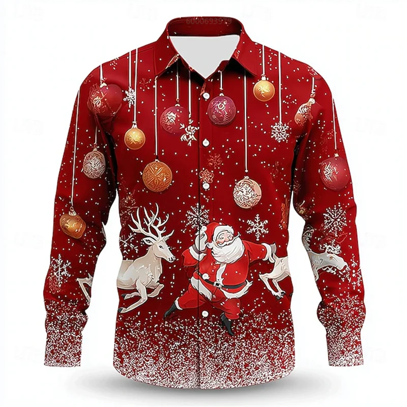 Natal masculino boneco de neve floco de neve camisa botão manga longa diversão festival ao ar livre outono inverno lapela 3d impresso camisa vermelha