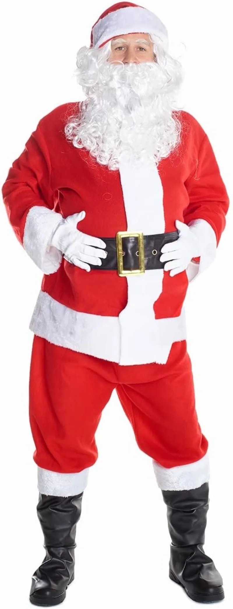 Conjunto de 8 fantasias de Papai Noel de Natal: top + calça + chapéu + barba + luvas + cinto + botas + bolsa de presente