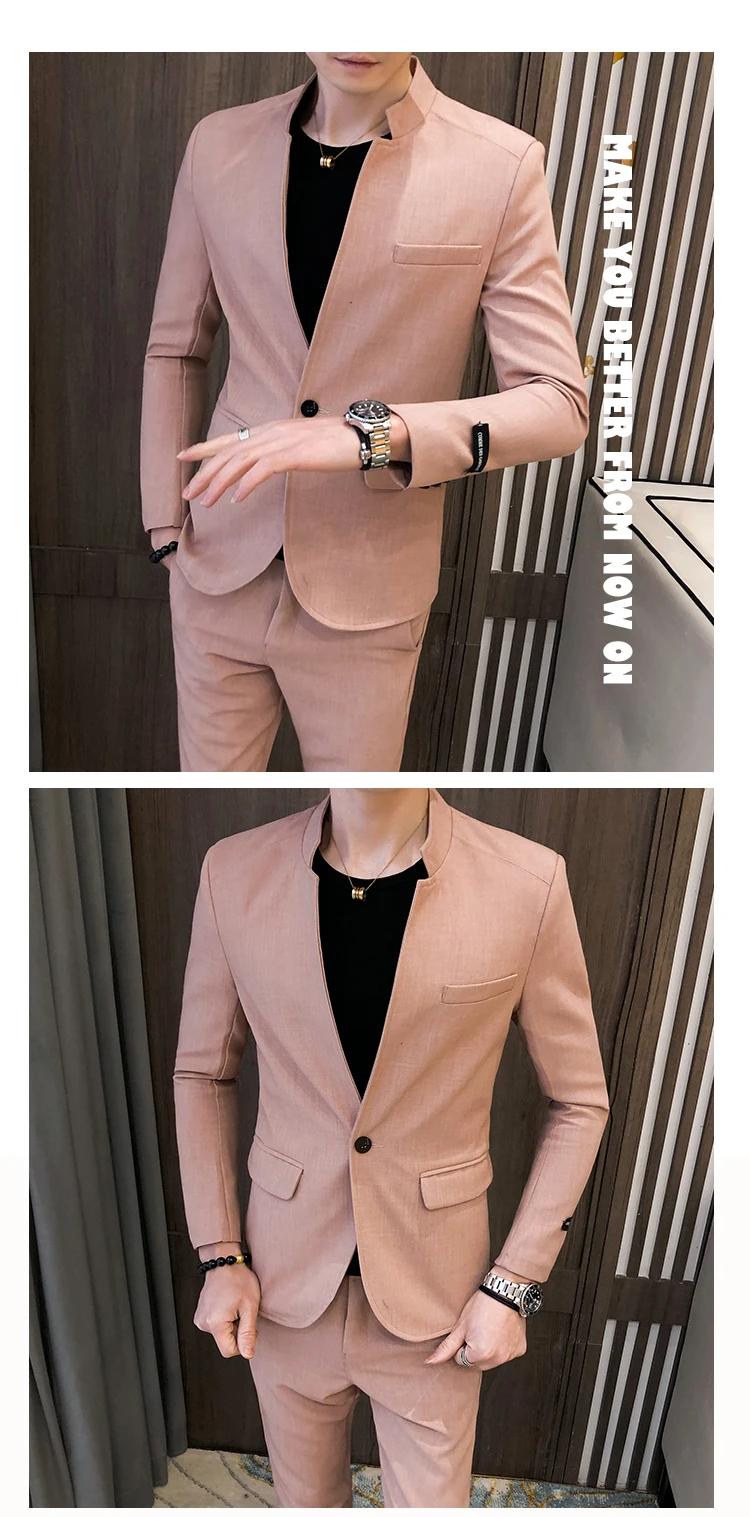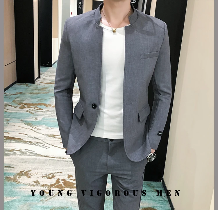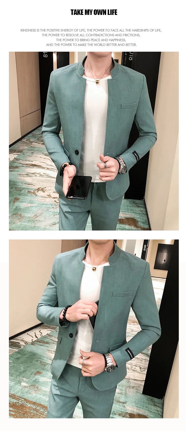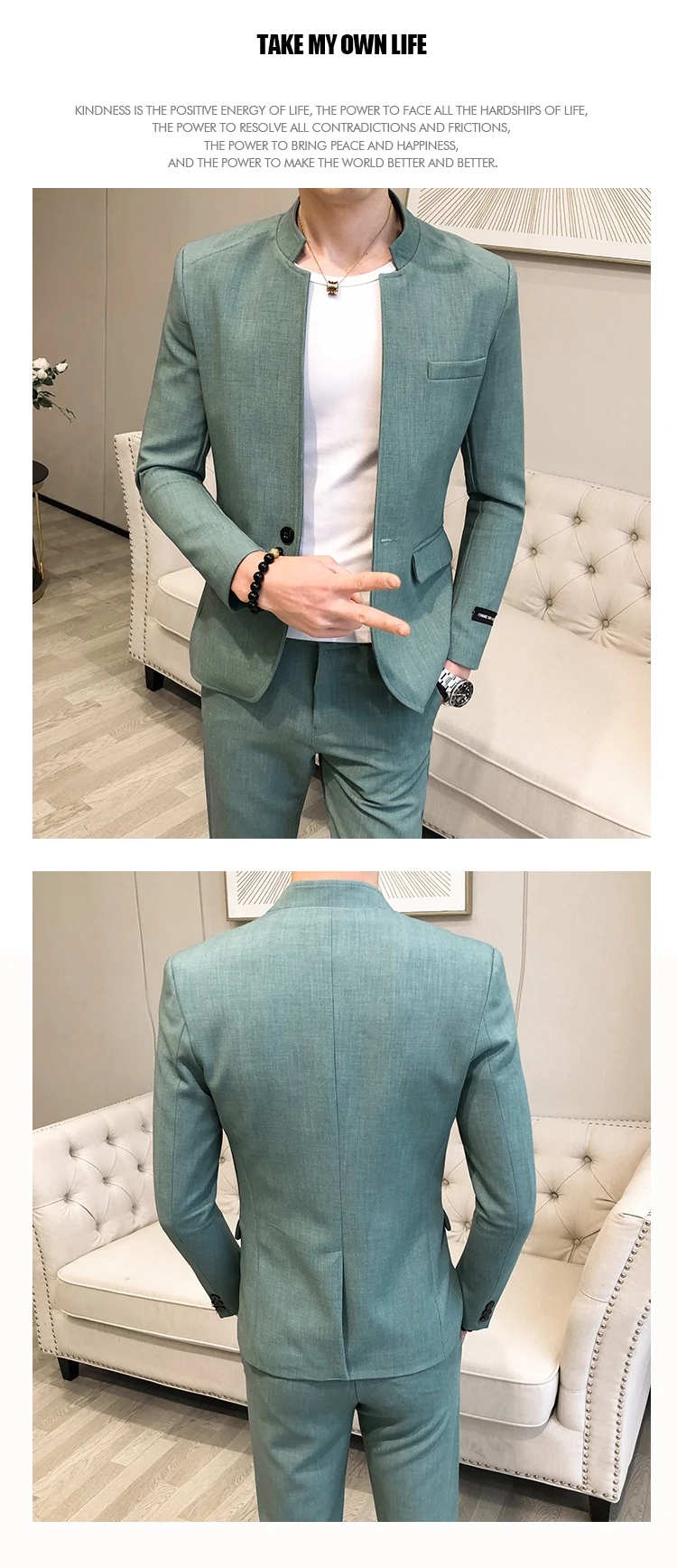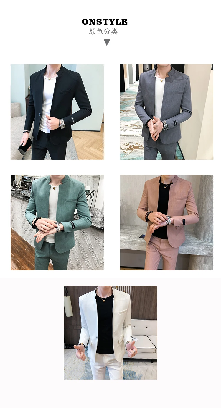 - > New (Blazer+ Pants) Men's Fashion Business Korean Version of Gentleman Zhongshan Stand Collar Casual British Style 2-piece Set