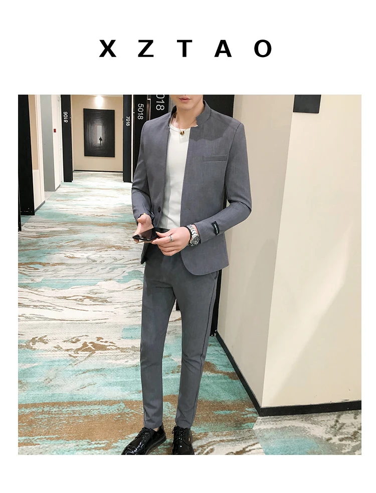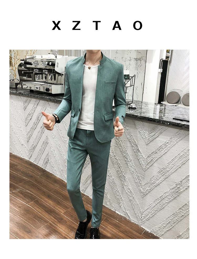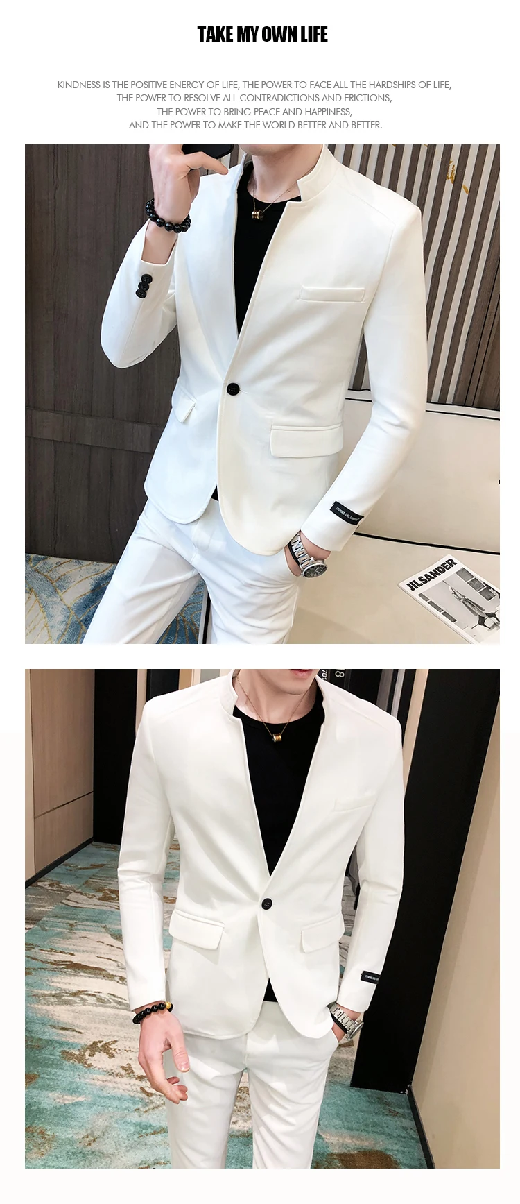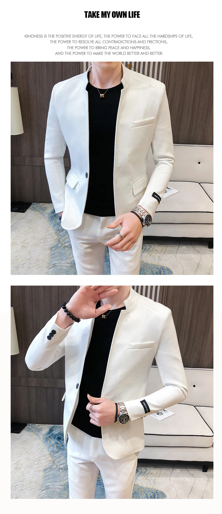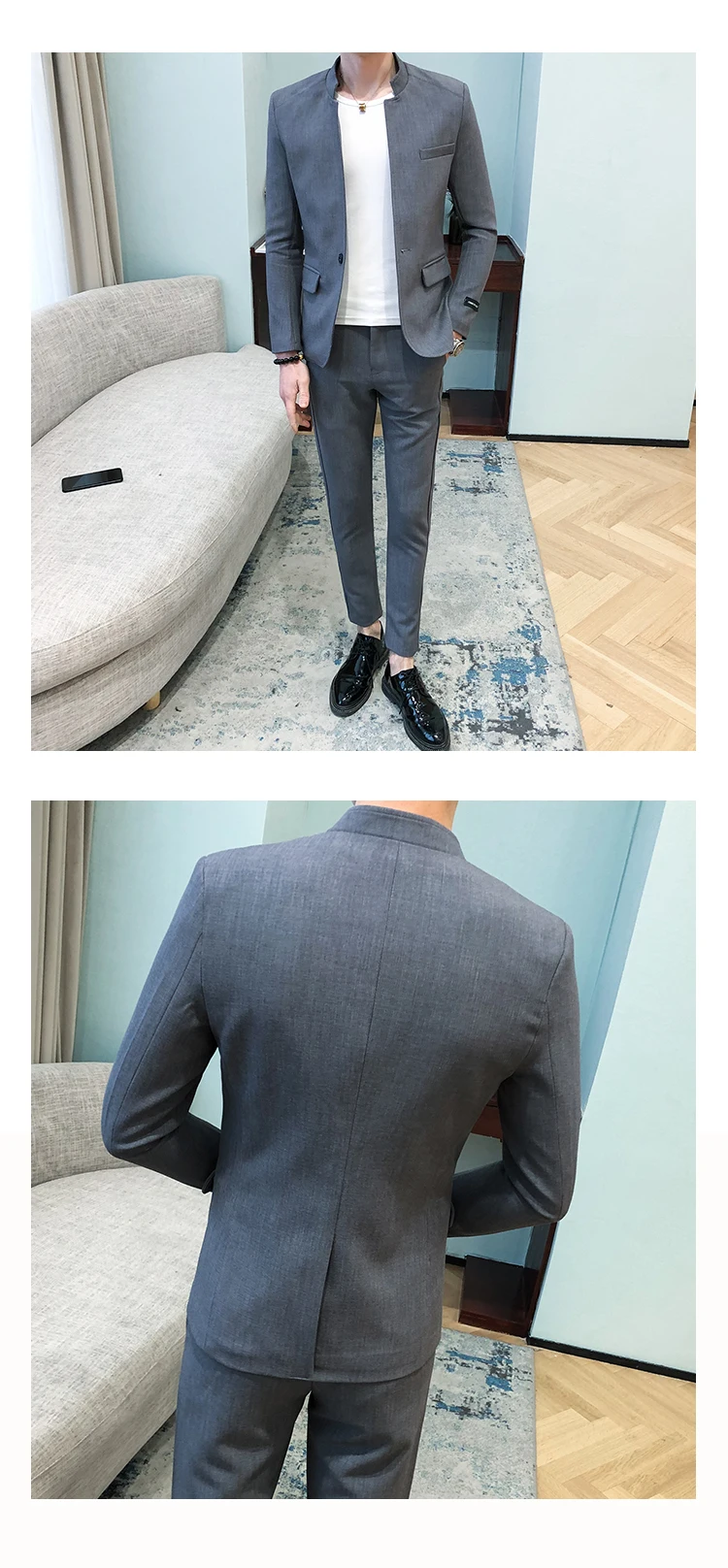 - > New (Blazer+ Pants) Men's Fashion Business Korean Version of Gentleman Zhongshan Stand Collar Casual British Style 2-piece Set