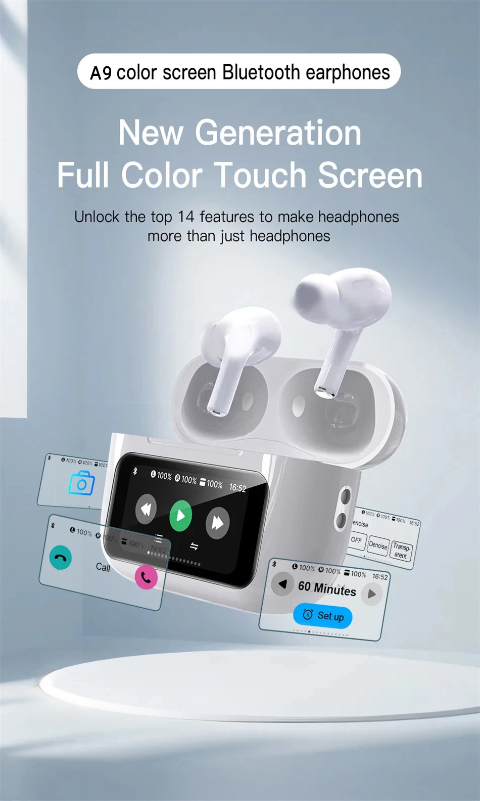 Nova configuração superior a9pro bluetooth lcd tela colorida inteligente sem fio redução de ruído ativo super longa bateria lifeheadset