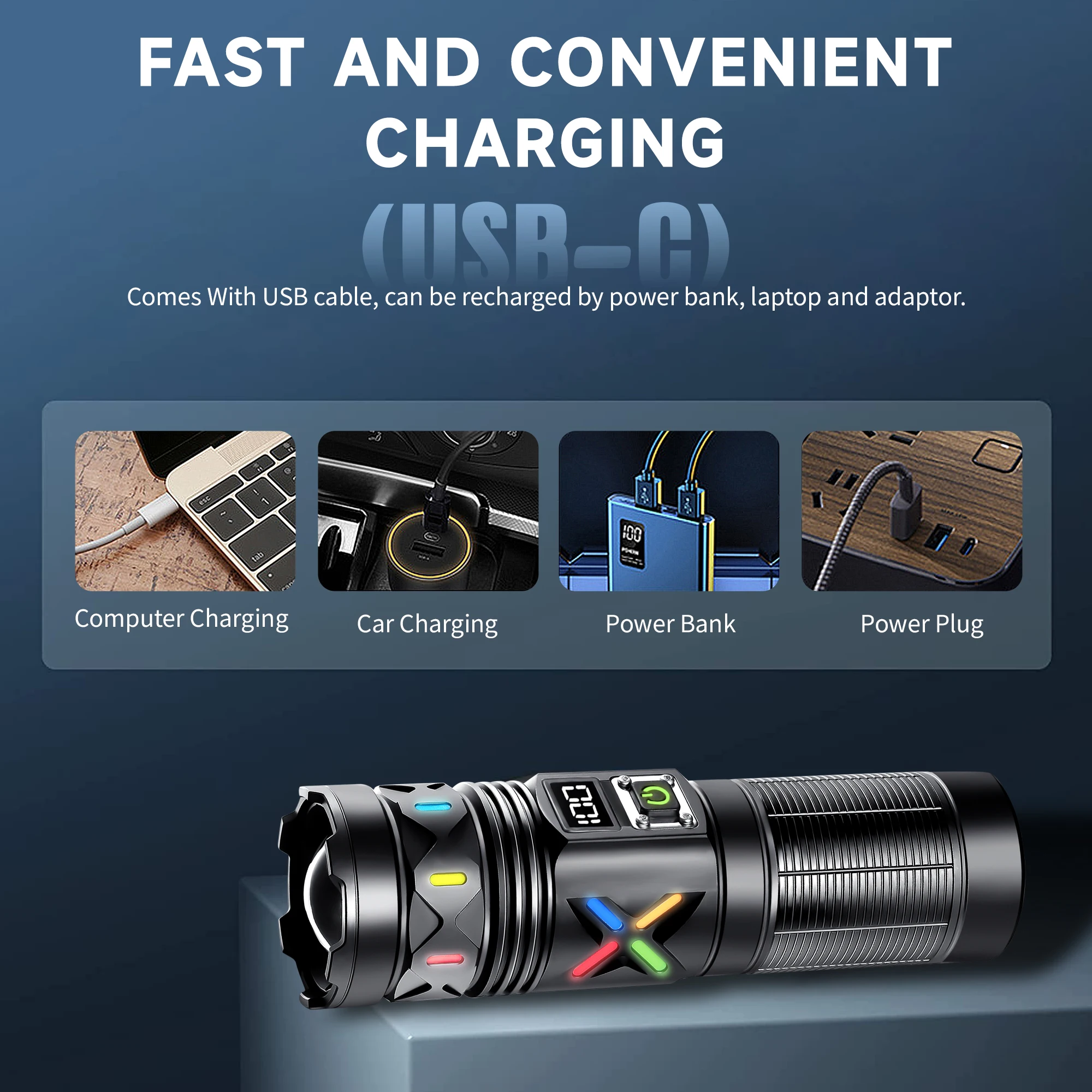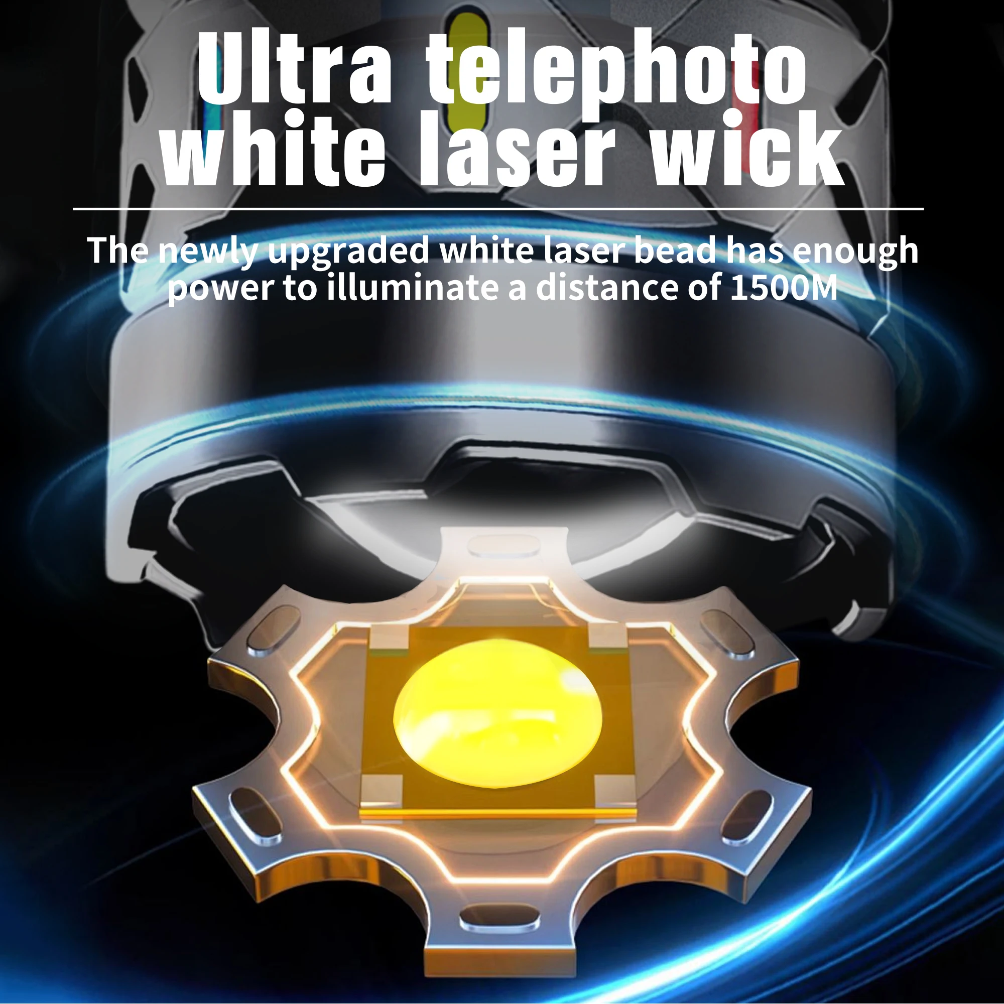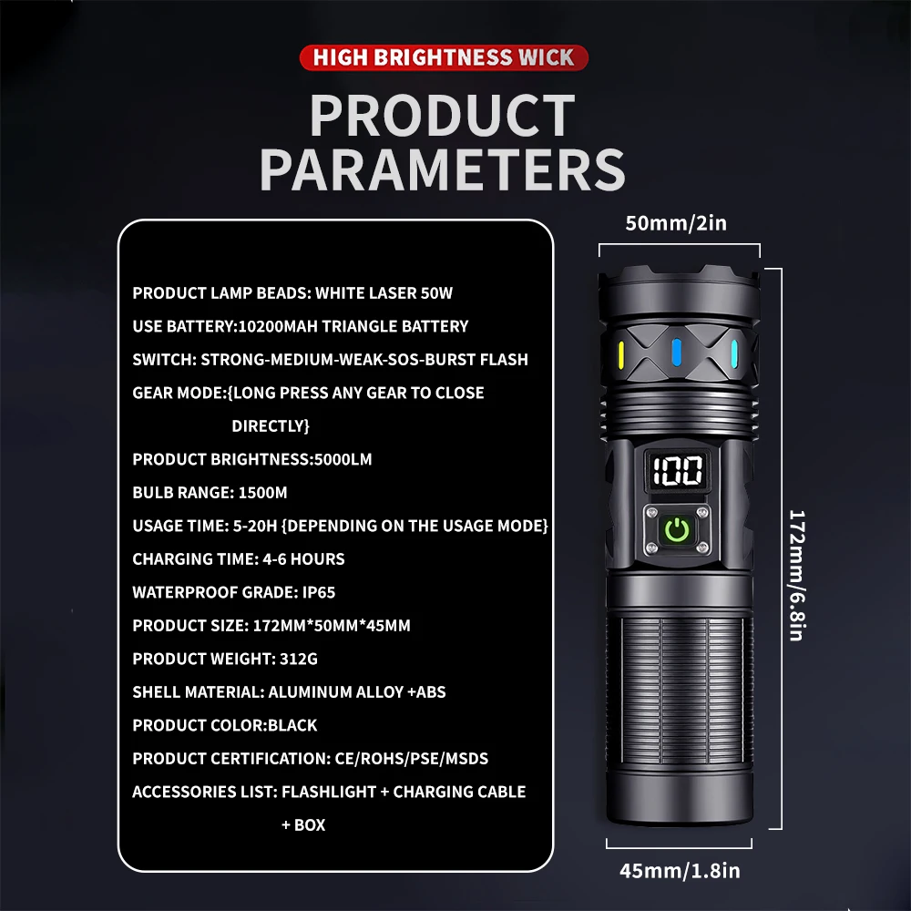 2.Características do produto: luz de alto brilhoe display de nível de bateria, projeção de alcance ultralongo, núcleo de lâmpada laser branco de alto brilho atualizado,Luz mais forte e brilhante, Carregamento de alta velocidade tipo C, design ergonômico, corpo confortável, dissipação de calor tipo Gill.