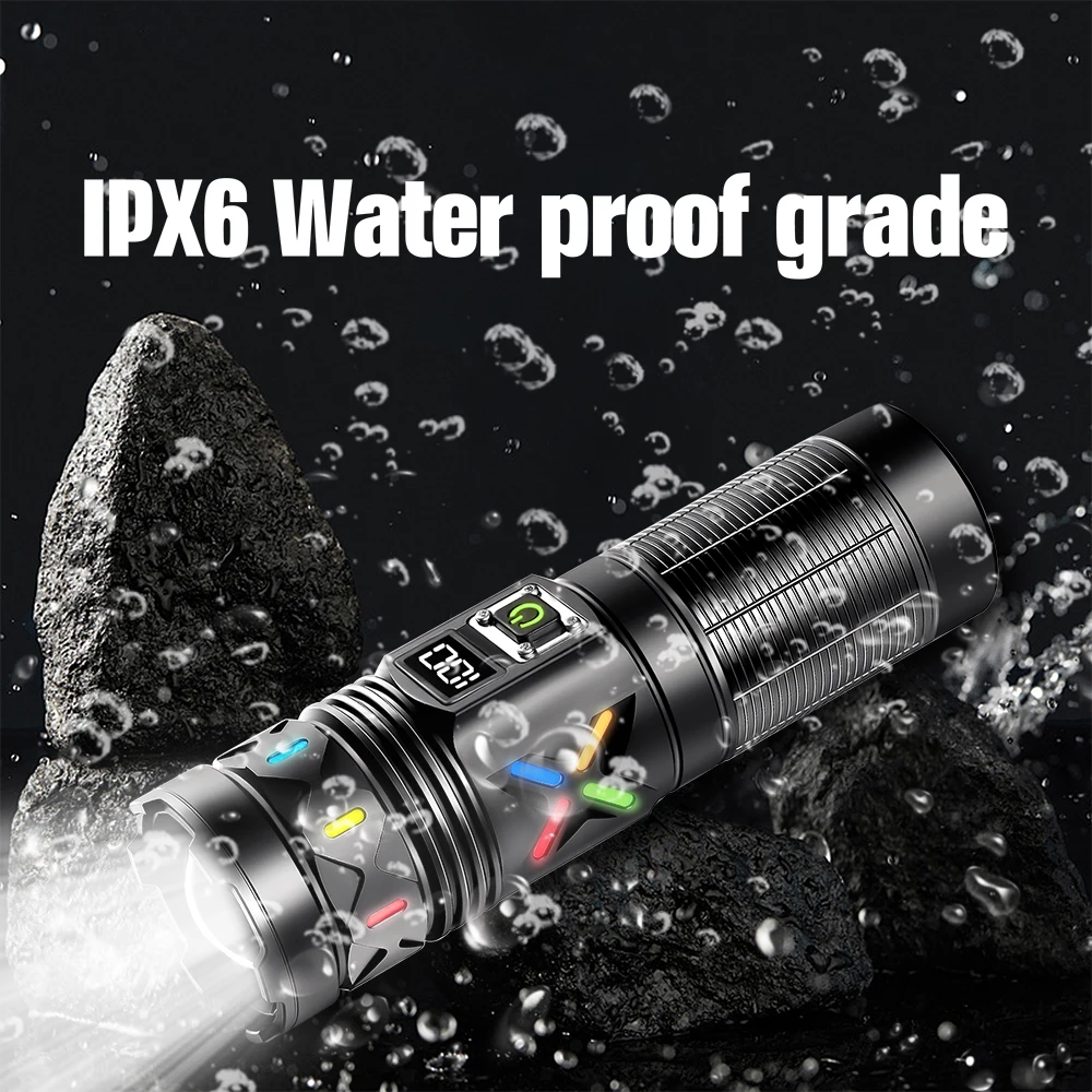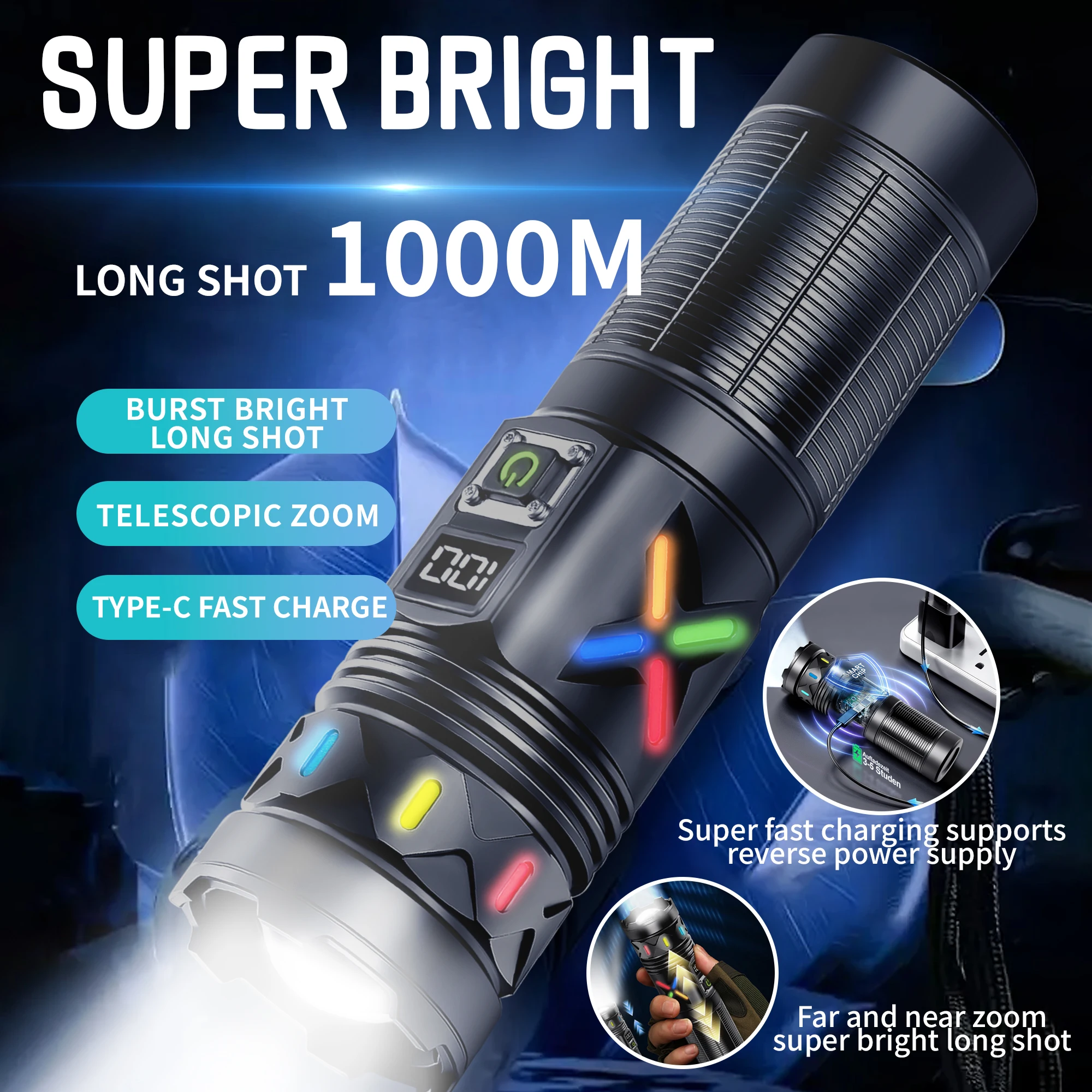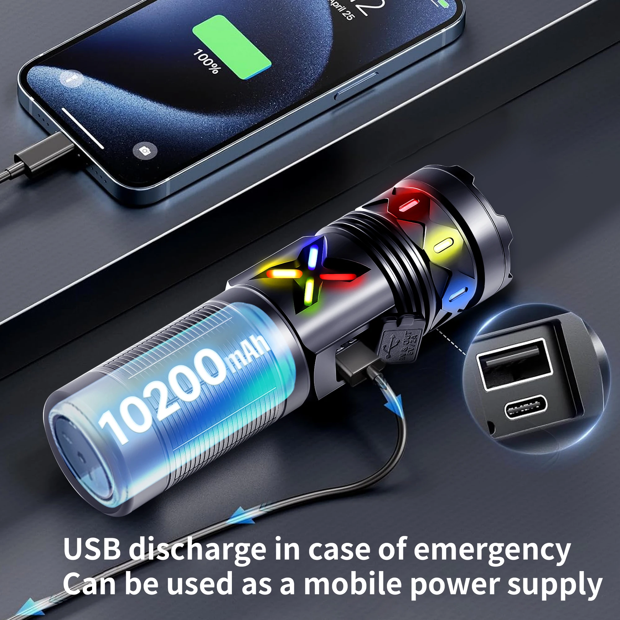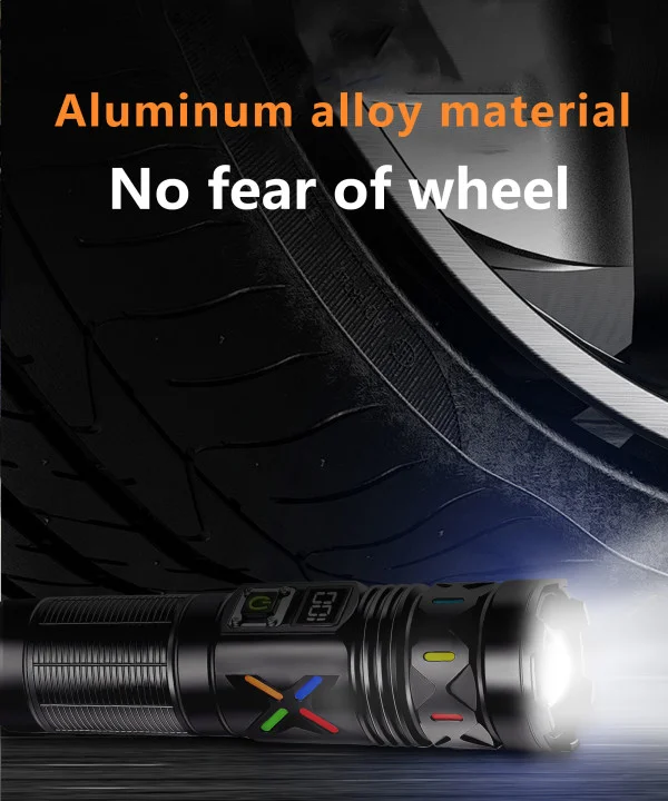 2.Características do produto: luz de alto brilhoe display de nível de bateria, projeção de alcance ultralongo, núcleo de lâmpada laser branco de alto brilho atualizado,Luz mais forte e brilhante, Carregamento de alta velocidade tipo C, design ergonômico, corpo confortável, dissipação de calor tipo Gill.