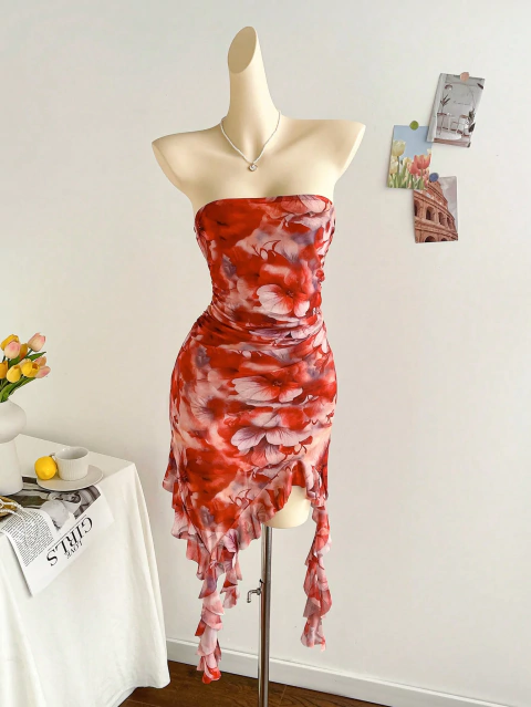 Nova primavera/verão senhoras sexy sem alças, bainha sem costas mini vestido irregular