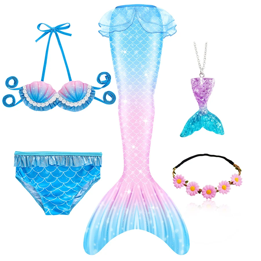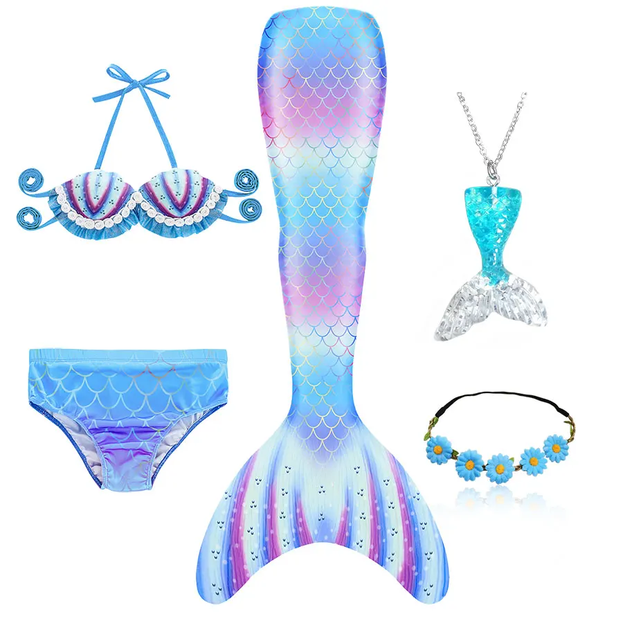 Pacote1: 1* Cauda de sereia + 1 * Tops + 1 * calcinha + 1 * guirlanda + 1 * colar de sereia (totalmente 5 itens/conjunto)