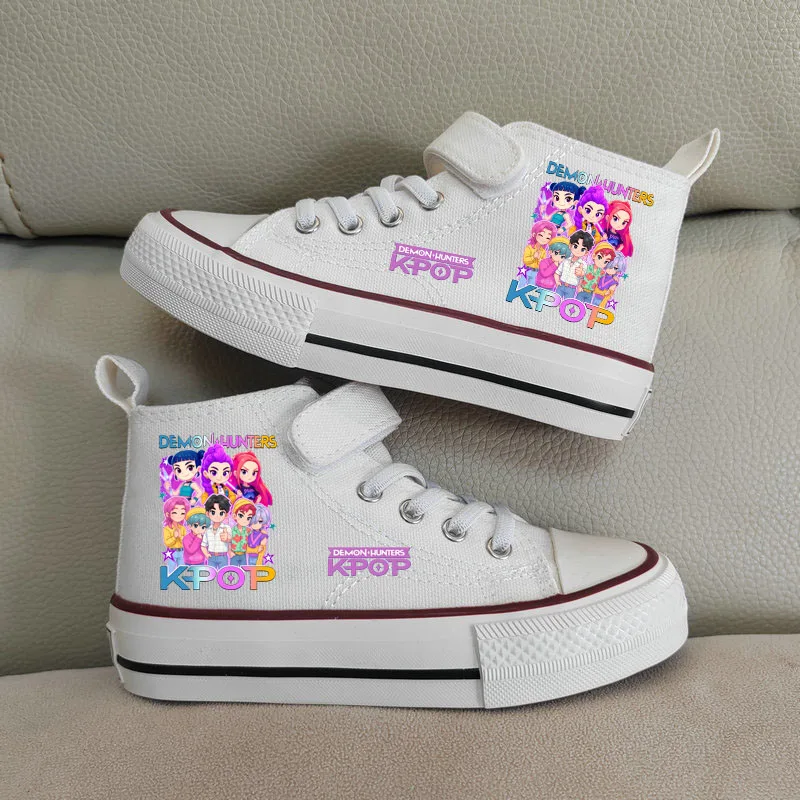 New Children Canvas Shoes High-Top Girls Shoes KPop Demon Hunters Kids White Board Shoes Student Running Tennis White Shoes