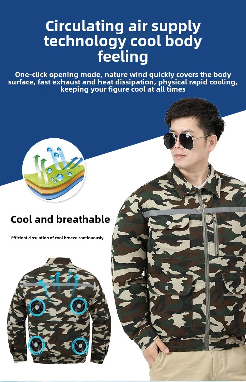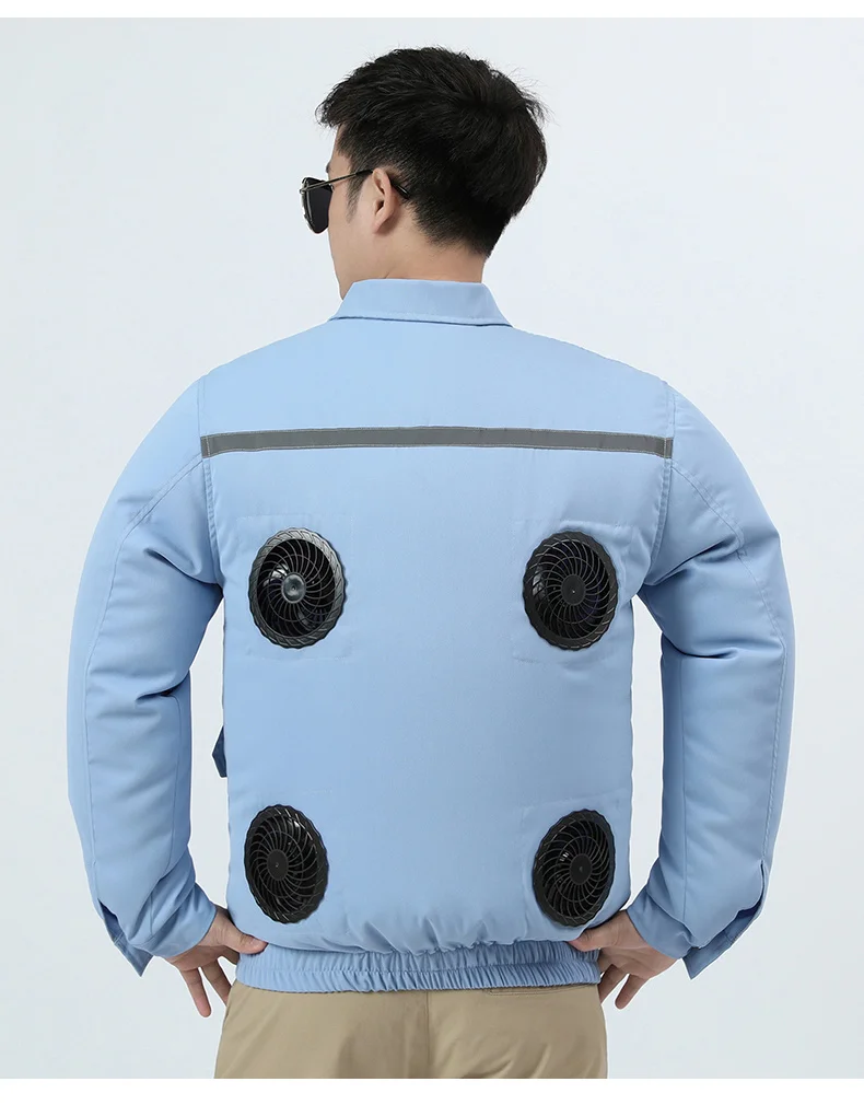 Um traje de ventilador é um terno com dois ventiladores de alta velocidade em cada lado da cintura. É alimentado pelo banco do carregador do telefone.O ventilador circula o ar externo, de modo que uma grande quantidade de ar flui ao longo da superfície do corpo, de modo que o suor evapore rapidamente, absorvendo o calor do corpo, de modo a obter o efeito de resfriamento.