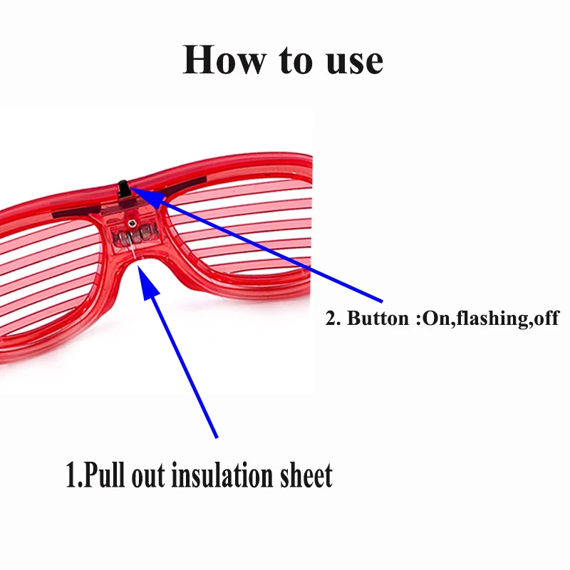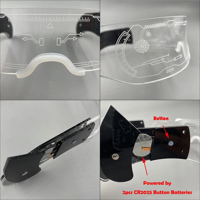 Os óculos LED são controlados por dois lados.Pressione o botão de mudança de cor do lado esquerdo, o LED mudará entre 12 cores.pressione o botão de mudança de cor do lado direito, o LED mudará entre 12 cores.