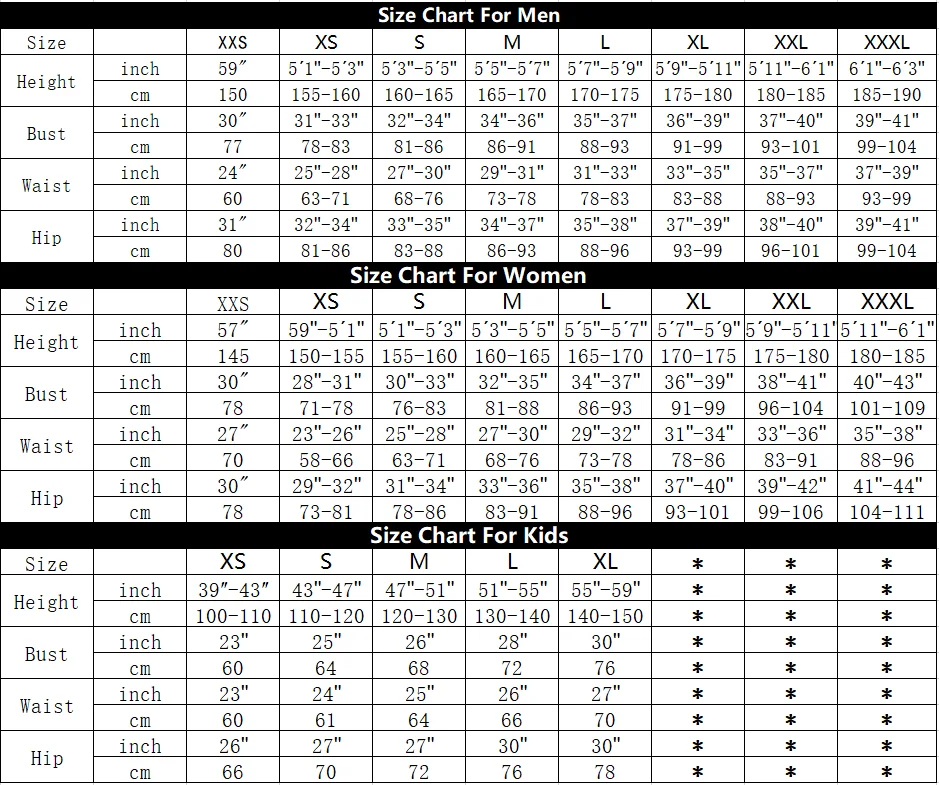 Tabela de tamanhos diferentes para diferentes gêneros, por favor, deixe-nos uma nota do seu gênero (homem, mulher, criança) ao escolher o tamanho. (Por exemplo Criança XL)