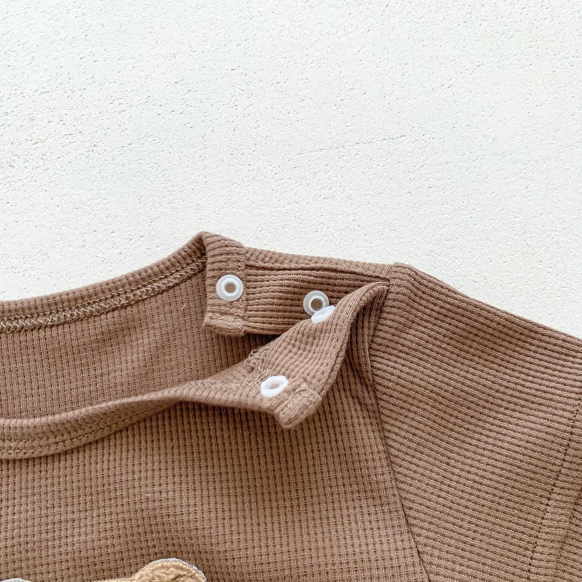 1.Design adorável e exclusivo de urso patch – O macacão apresenta um design de urso patch fofo e exclusivo que é perfeito para meninas e meninos.O urso adiciona um toque extra de fofura ao look.