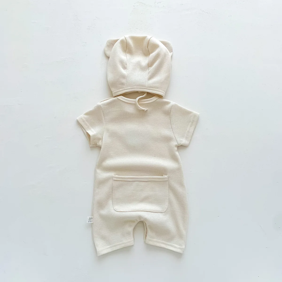 - > Novo no verão crianças do bebê meninas meninos manga curta waffle remendo urso infantil recém-nascido macacões de algodão presente chapéu com orelha