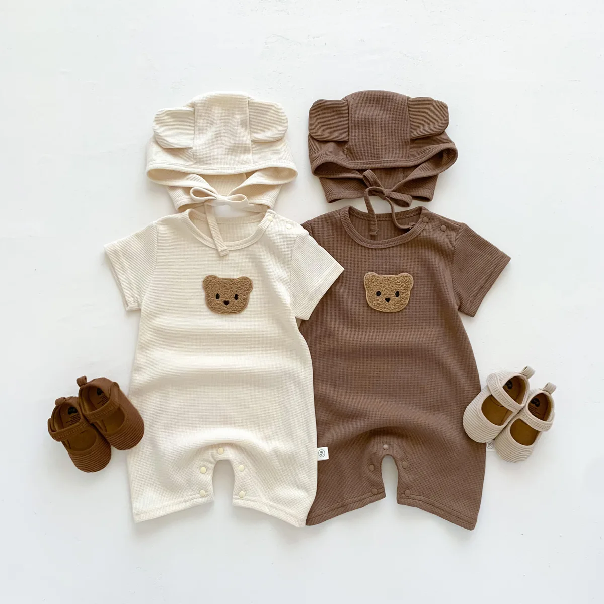 Novo no verão crianças do bebê meninas meninos manga curta waffle remendo urso infantil recém-nascido macacões de algodão presente chapéu com orelha
