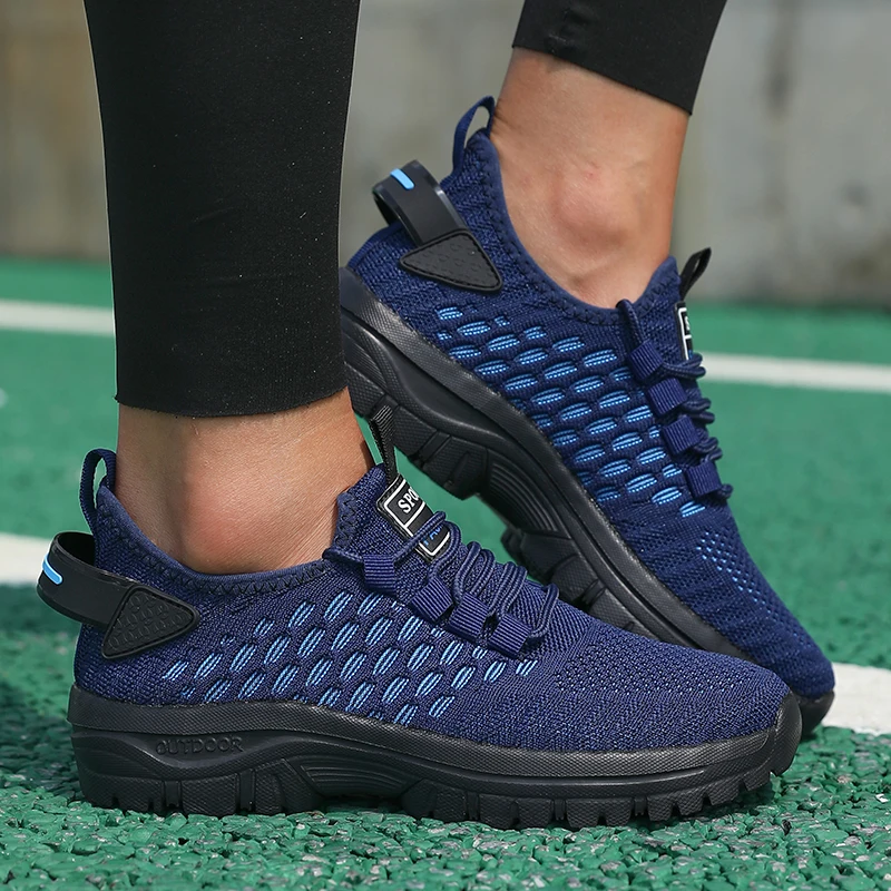 Novo tênis de corrida acolchoado feminino malha respirável sola macia tênis moda para a frente leve sapatos de exercício ao ar livre