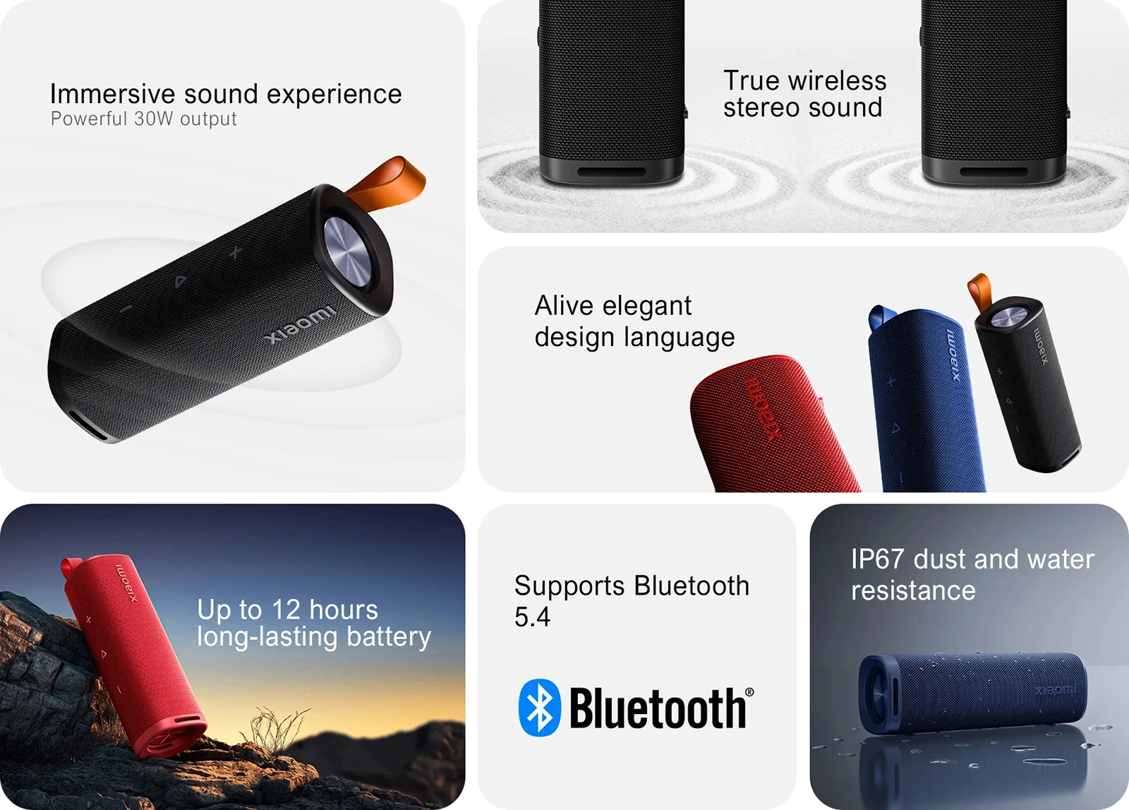 *Xiaomi Sound Outdoor não é um alto-falante profissional à prova d'água e oferece apenas recursos básicos à prova de respingos e poeira.A eficácia à prova de respingos e poeira pode reduzir ao longo do tempo com o desgaste.Não carregue debaixo d'água ou em ambientes úmidos.Os danos causados pela água não são cobertos pela garantia.