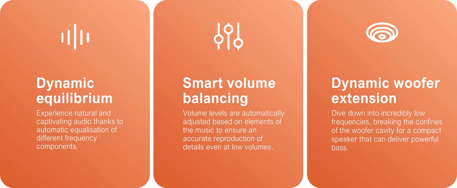 ● Qualidade de som magistral: habilmente ajustada com equilíbrio dinâmico, balanceamento de volume inteligente e extensão de woofer dinâmica para áudio superior.