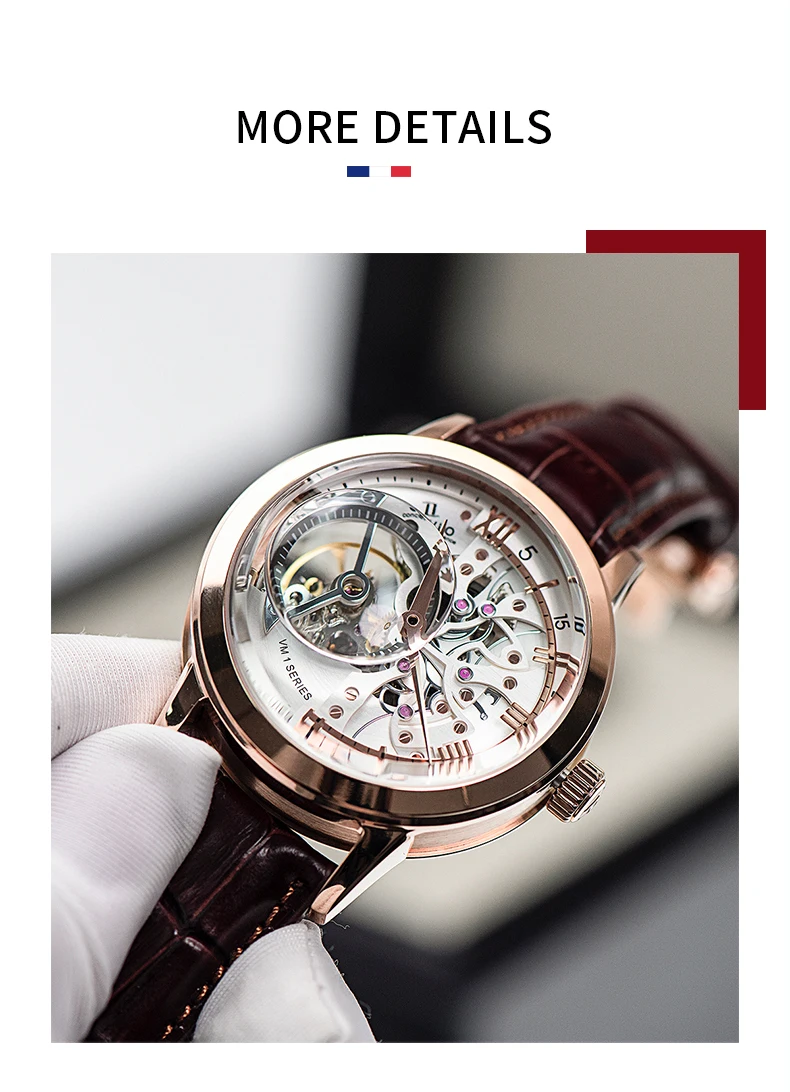 - > OBLVLO Luxo Retrô Casual Masculino Esqueleto Automático Relógios Mecânico Pulseira Pele de Bezerro Vidro Cristal Mineral Mostrador À Prova D' Água 45 VM