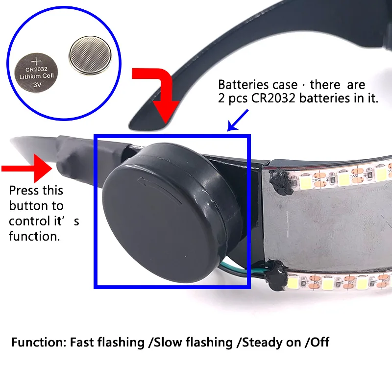 Como usar: Há um botão liga / desliga na lateral da caixa de bateria preta.Mova-o para um lado para ligar os óculos.Em seguida, usando um controlador sem fio, o modo de iluminação, a velocidade e o brilho dos óculos podem ser controlados, permitindo até 358 efeitos de padrões diferentes.