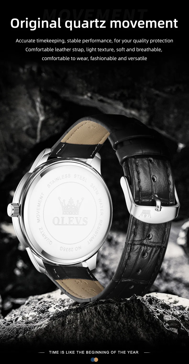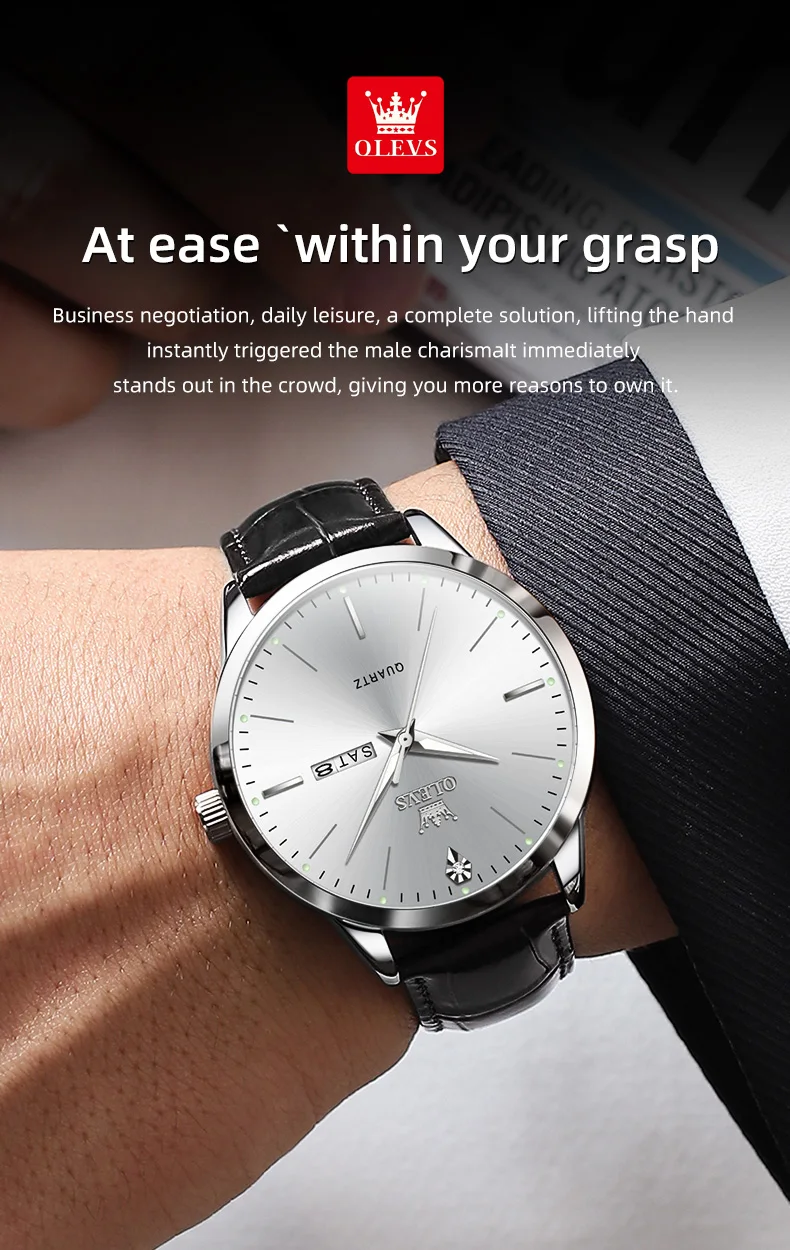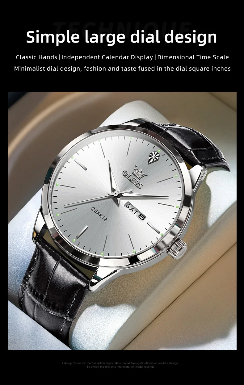 - > OLEVS-Relógio Quartz Masculino, Relógio de Pulso em Couro, Big Dial, Calendário Duplo, Impermeável, Luminoso, Top Brand, Moda, 2935, 43mm