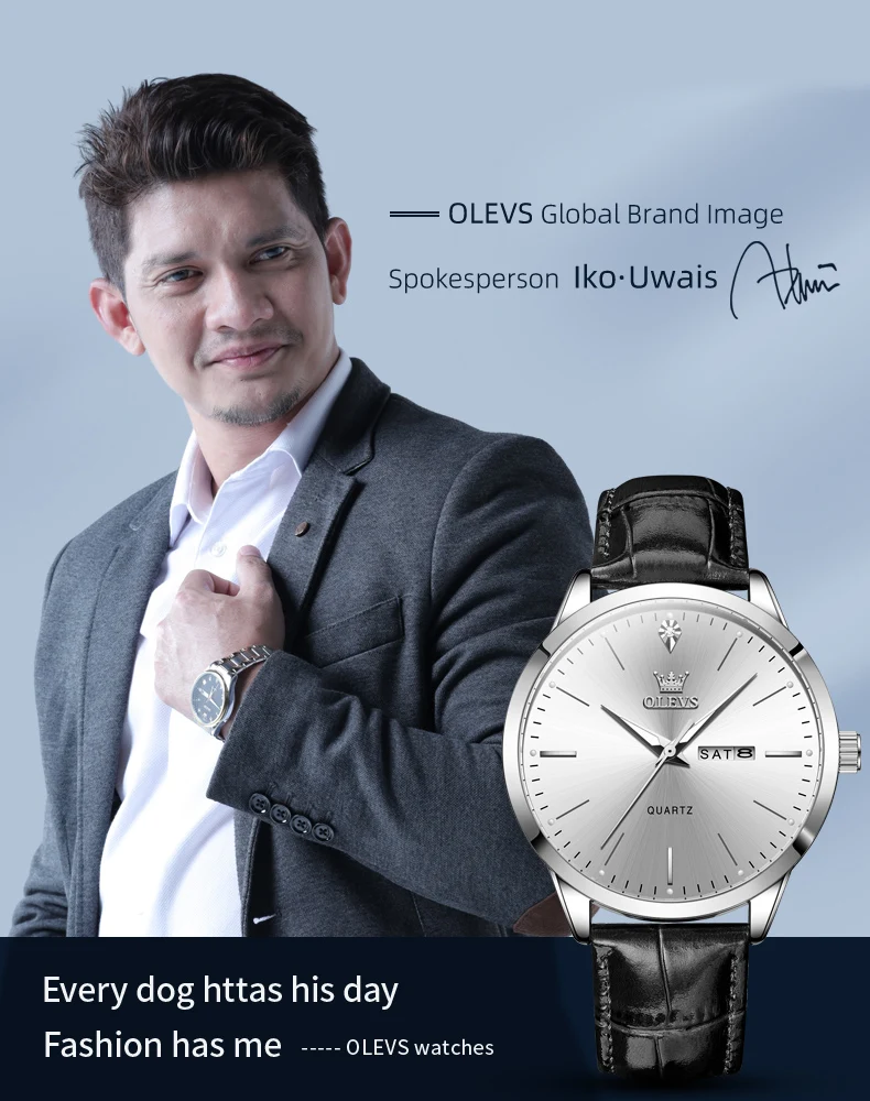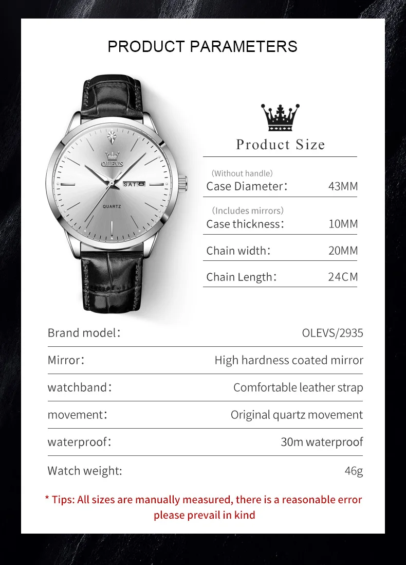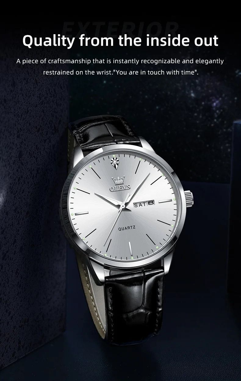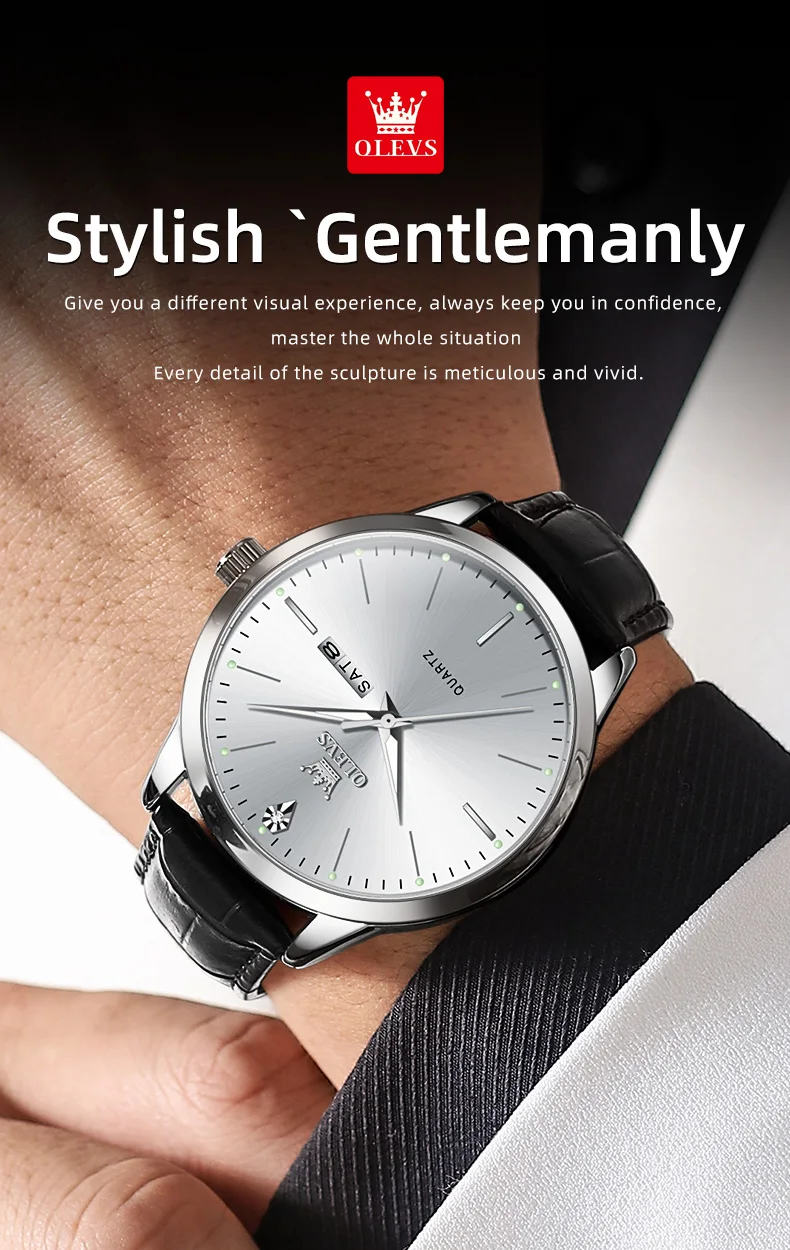 - > OLEVS-Relógio Quartz Masculino, Relógio de Pulso em Couro, Big Dial, Calendário Duplo, Impermeável, Luminoso, Top Brand, Moda, 2935, 43mm