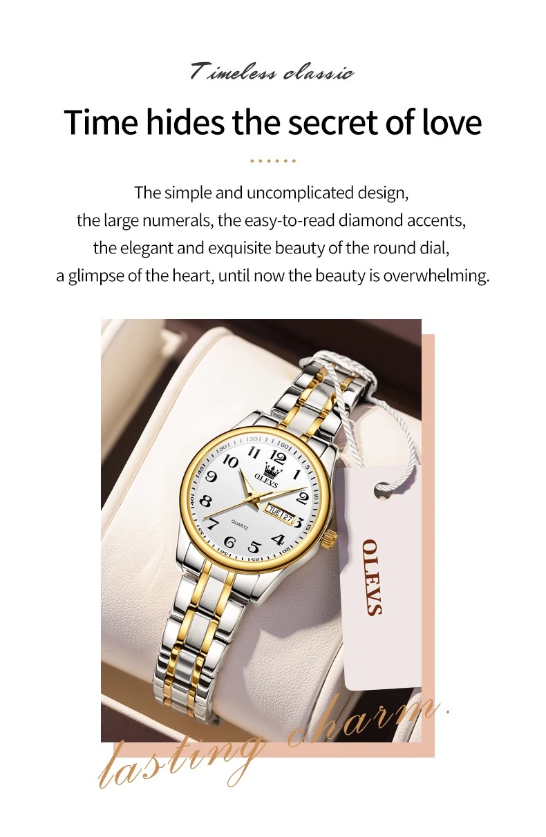 • Movimento de quartzo de luxo :O relógio feminino Olevs apresenta um luxuoso movimento de quartzo, garantindo uma cronometragem precisa e uma estética de alta qualidade.